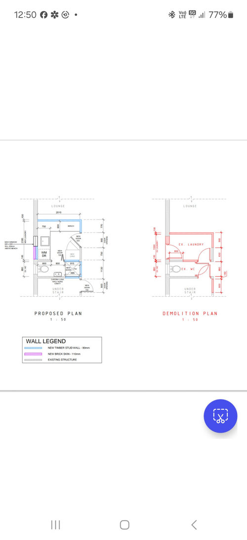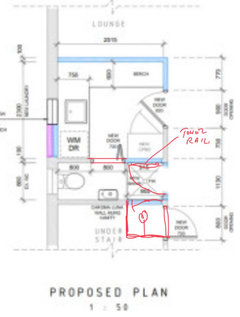 Hi all, I'm renovating the powder room and adjoining laundry downstairs. Adding a shower where the 3 doors are. Space is quite tight for shower and toilet. Was going to put a cavity slider between laundry & powder room as I still want to be able to use the laundry if someone is in the toilet. But it will be a tight squeeze. I'm already moving the back of the laundry wall out 750mm, so I can't move it anymore.