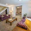 Sofás en color vino con estilo clásico que contrastan con la moderna escalera.