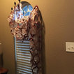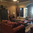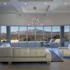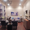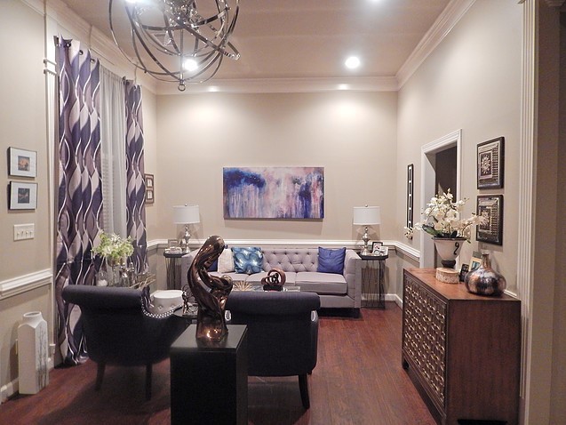 Accessories, Floral arrangement, Ceiling light fixture, and Lamps make bold statements in this Living Room design.
