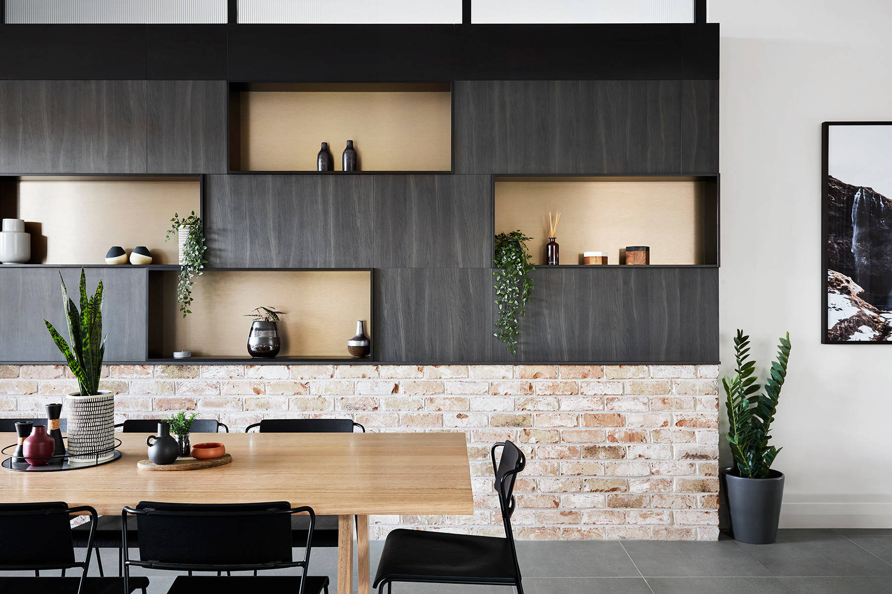 Features: Taking the shelving unit the full width of the wall maximises storage and display space, and creates an arresting visual feature.