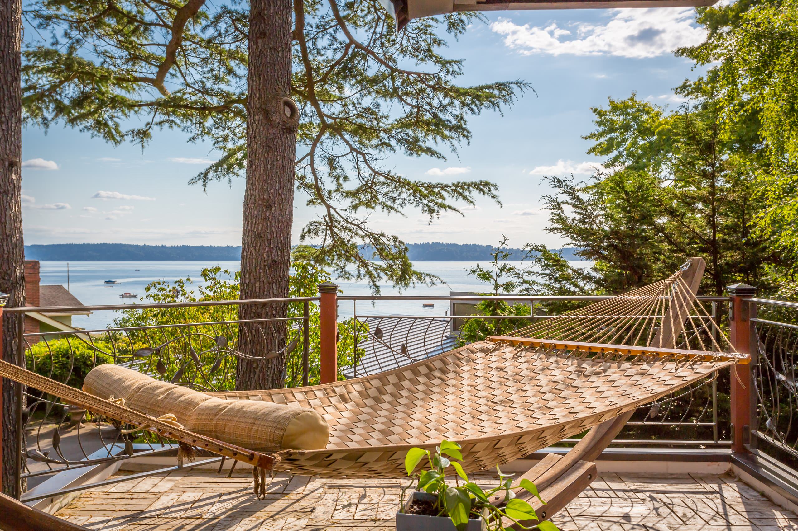 Features: A humble hammock piled high with comfy cushions.