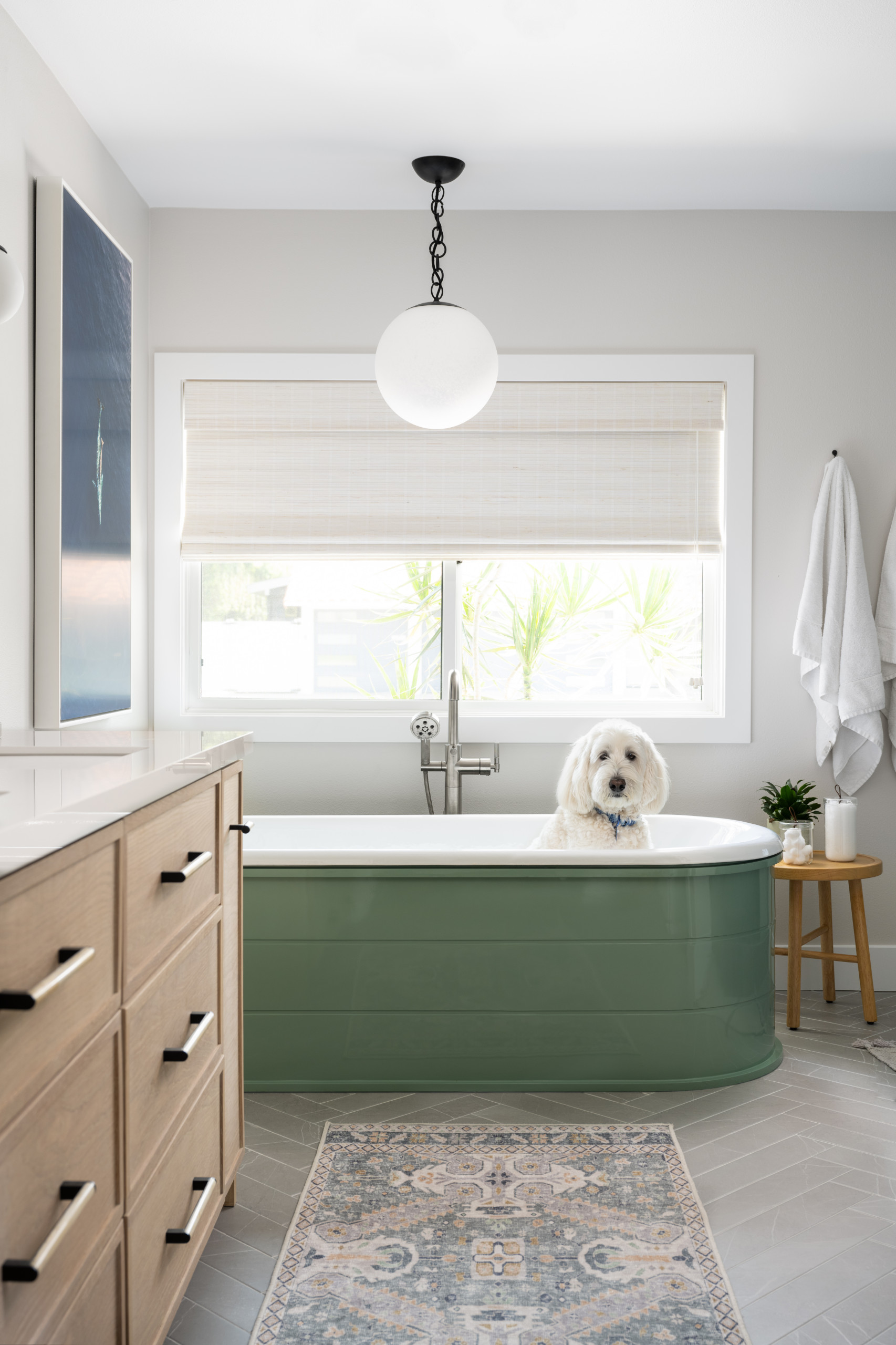 26. This bathtub in California isn’t a dog-washing station per se, but its handheld shower makes shampooing a pooch in it much easier. Plus, we couldn’t resist sharing such a fabulous green tub and adorable pup!