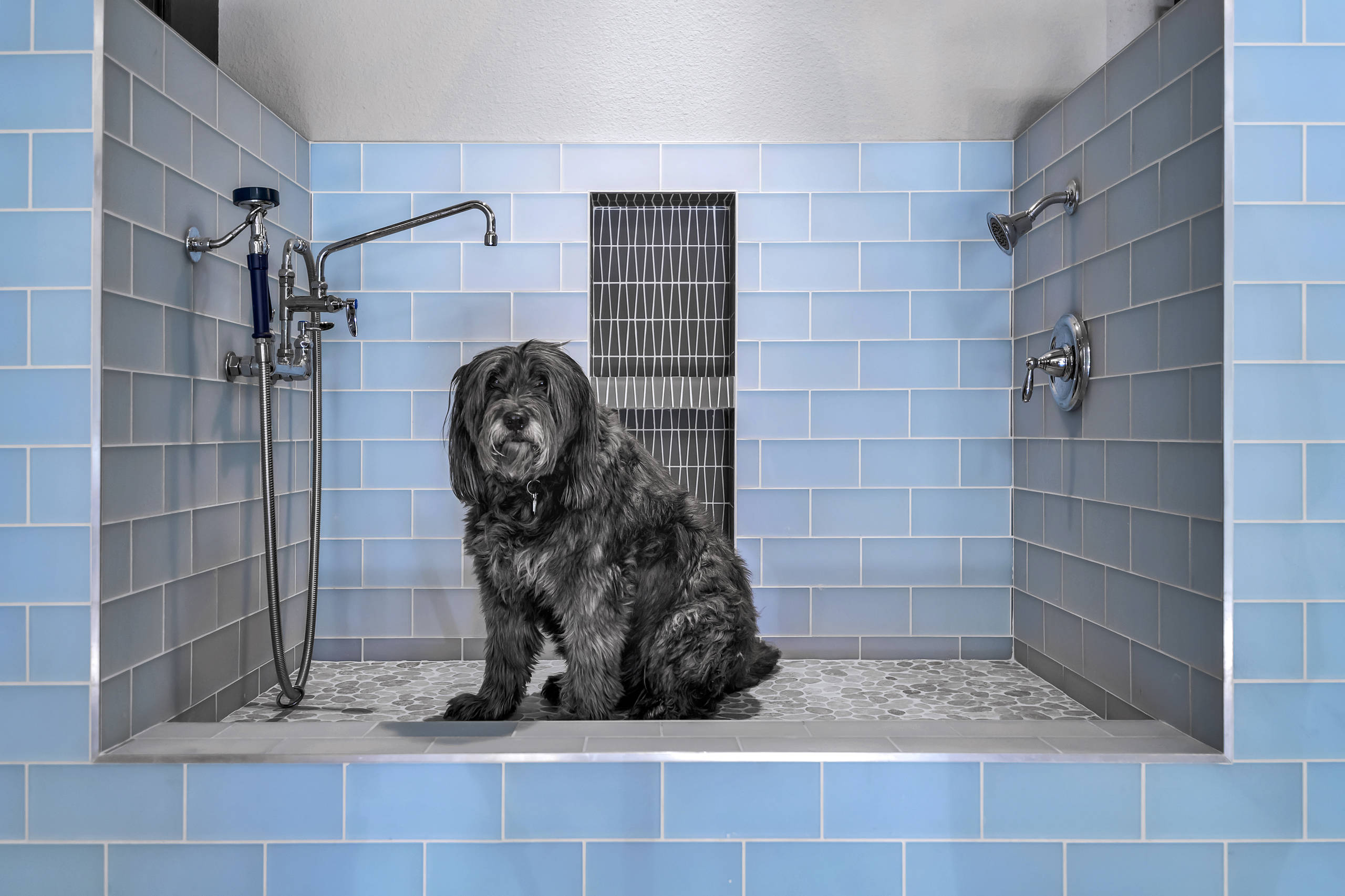 18. Zoom in on the back wall of this shiny Houston dog wash: how fun are those bone accent tiles? The glass splash guards on the tub’s sides are also a smart addition.