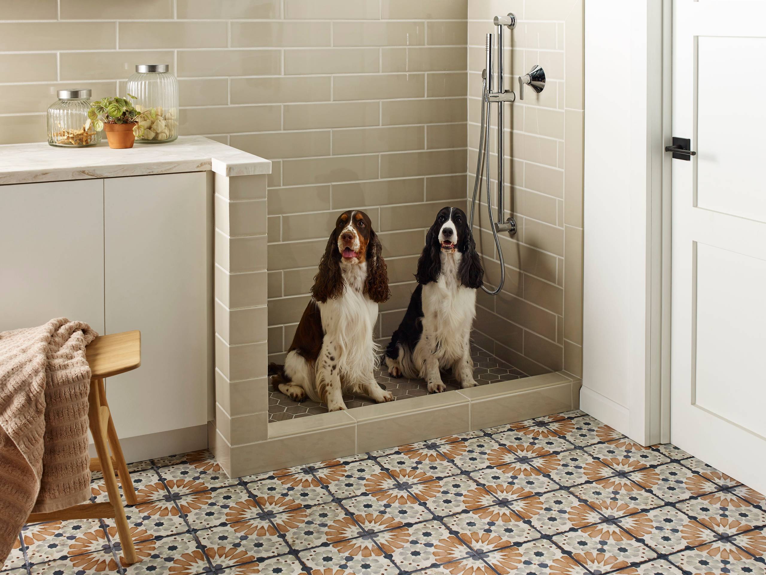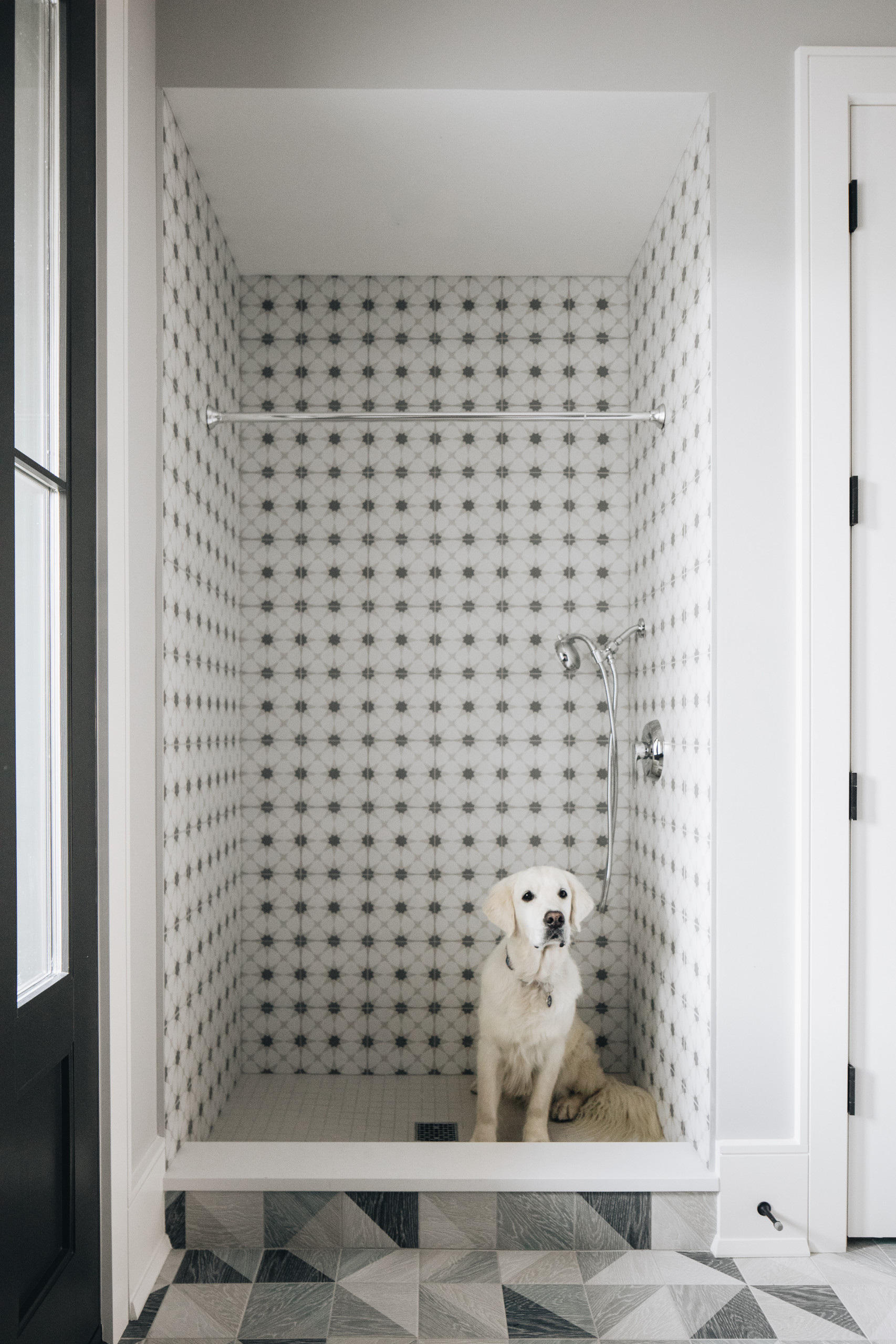 12. Neutral subway tiles protect the walls in this dog shower in California, while pretty patterned porcelain tiles on the main floor add pizzazz.