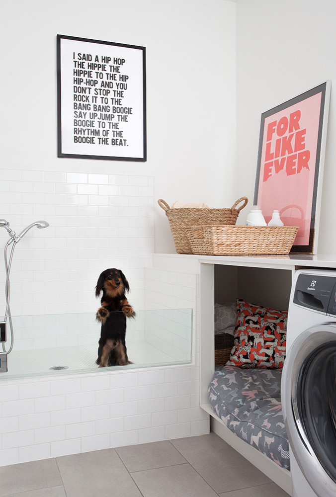 11. In this laundry in Texas, a glass door keeps the owners’ little guy inside the dog shower, but it swings open for larger dogs to jump onto the platform.