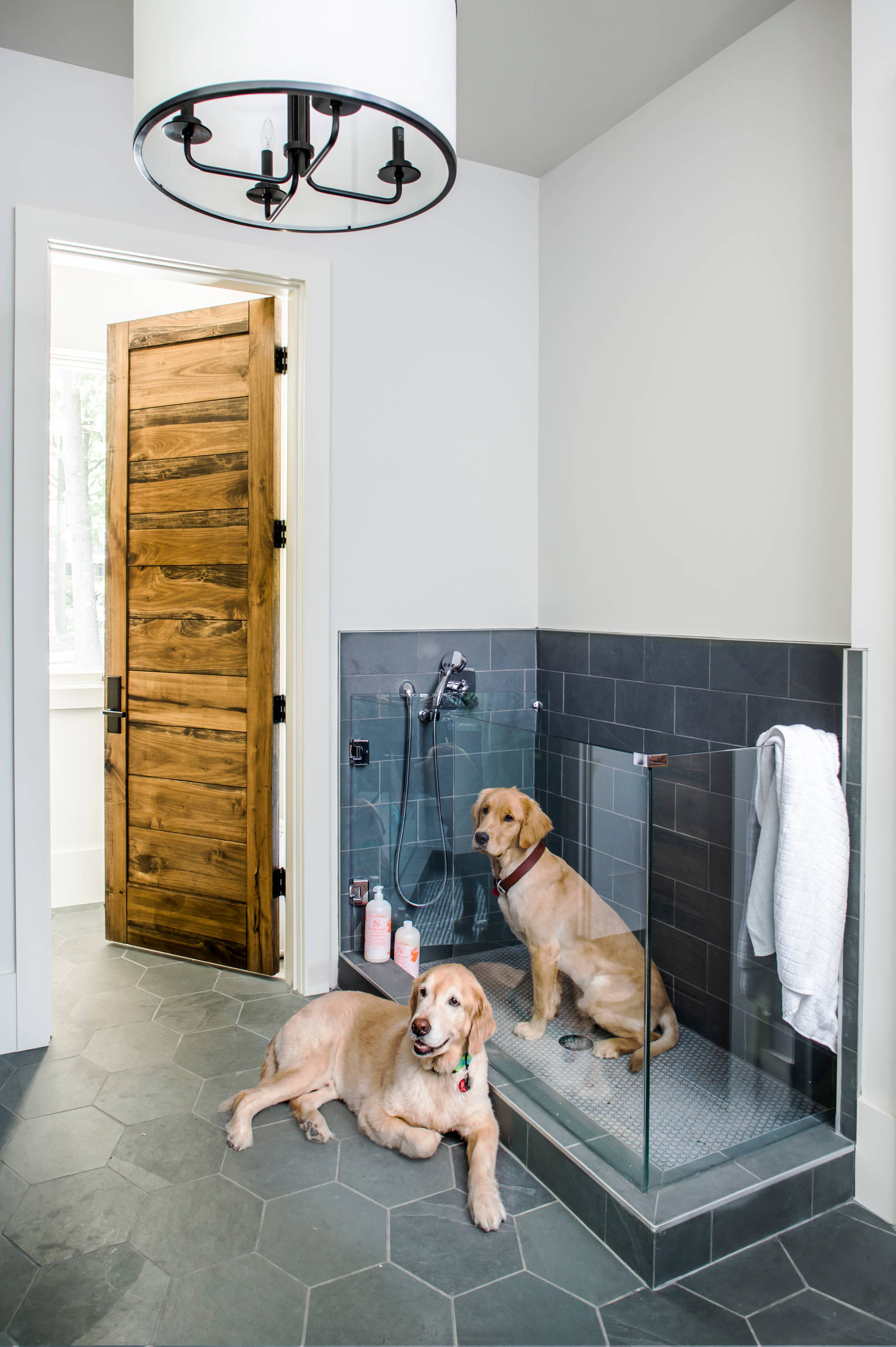 14. These buddies look pretty pleased with their custom dog shower and its glass surround. Inside is a penny-round tiled floor, with slate tiles on the main floor.