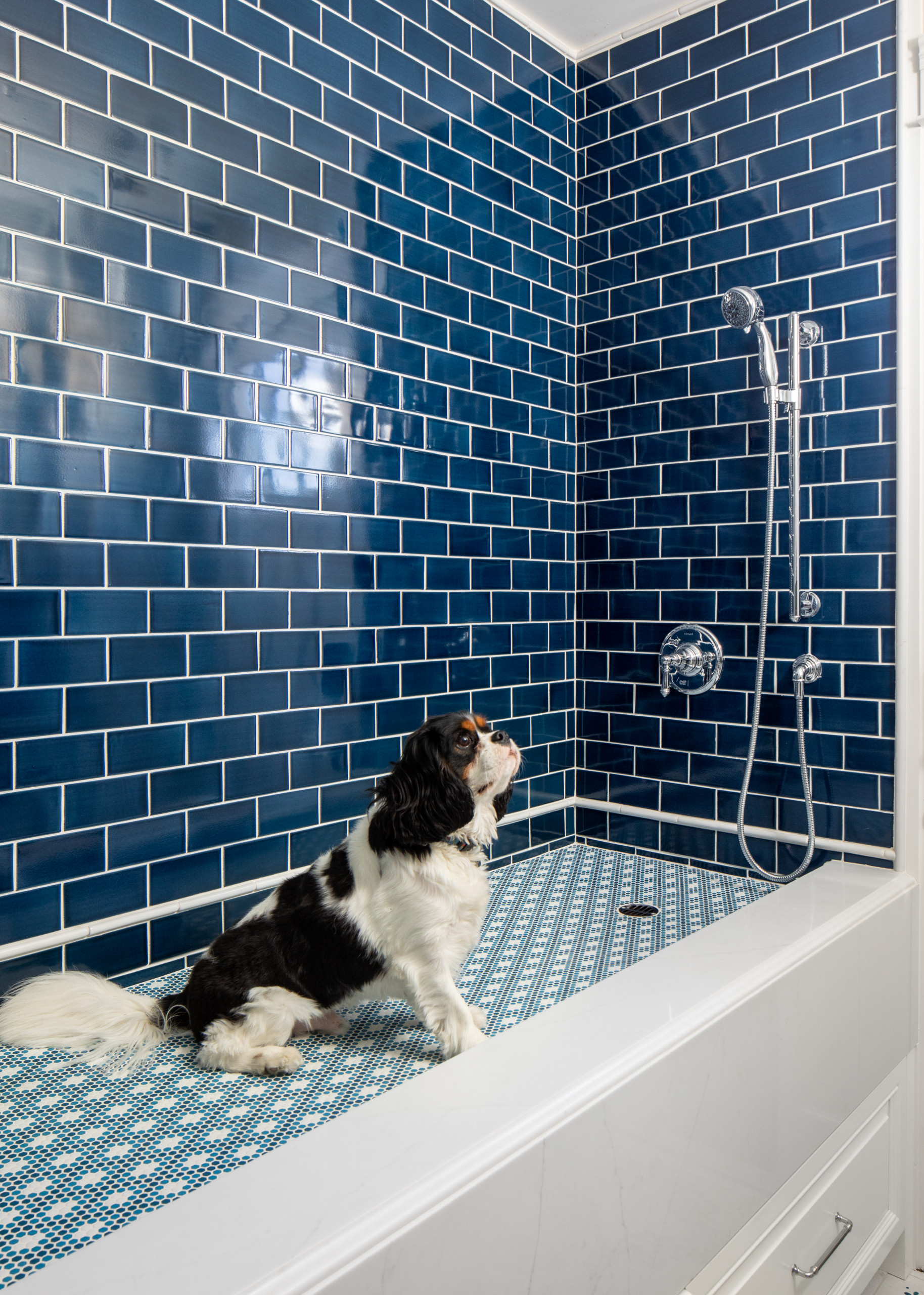9. Beautiful blue tiles cover the walls and floor of this raised pet shower, which is in a Georgian Revival estate in Los Angeles. Drawers make good use of the space underneath.