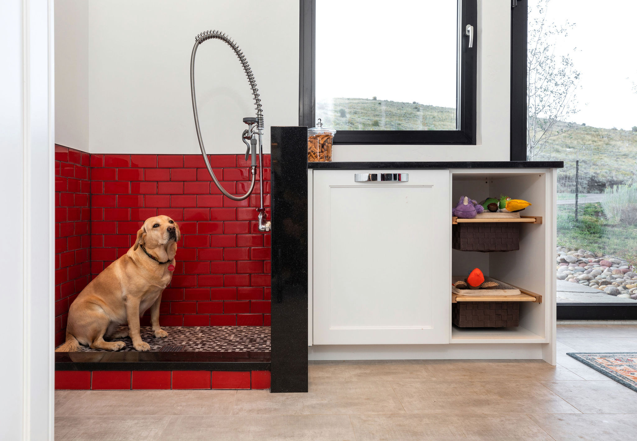 7. In this Colorado mountain home’s mudroom, the dog shower’s vibrant red tiles pop against the black-and-white backdrop. To the right, handy pull-out baskets help corral dog toys.
