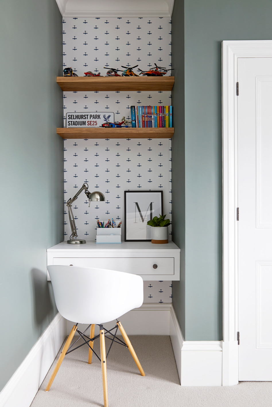 This brilliant decision means Niven’s son, Max, has a desk and shelves in addition to clothes storage, plus the area adds interest to the room in terms of display and an eye-catching backdrop. “I had a bit of fun with it and added some wallpaper featuring planes,” she says.