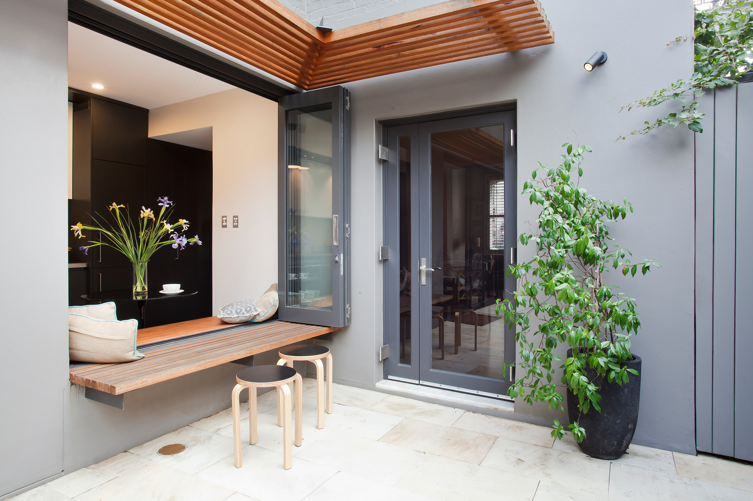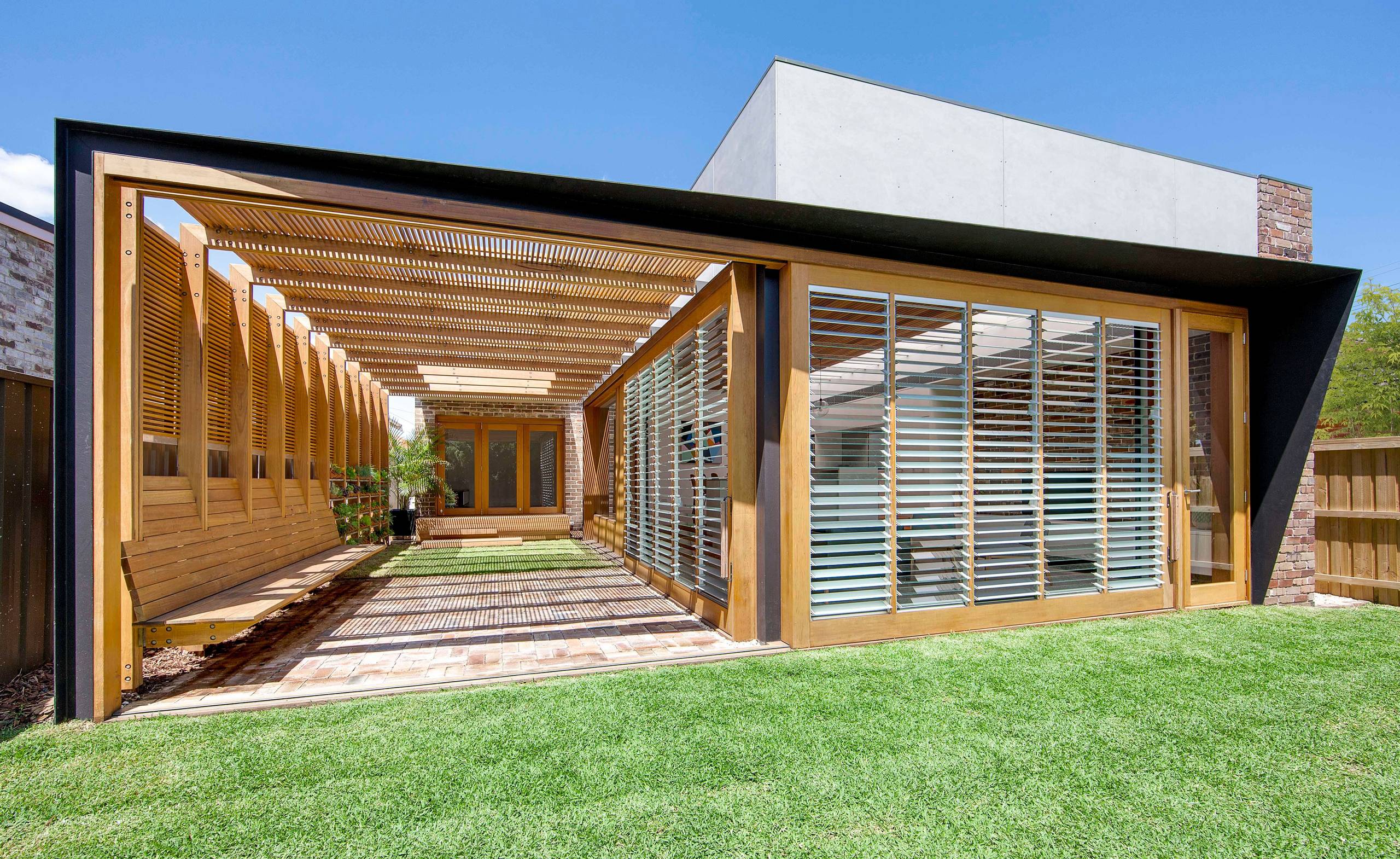 This house has large sliding doors with louvre panels. The doors can cleverly be positioned to enclose the indoor living area or the outdoor courtyard, or to open the two spaces up to each other. A single-hinged door allows for easy access from indoors to out without sliding the larger doors.