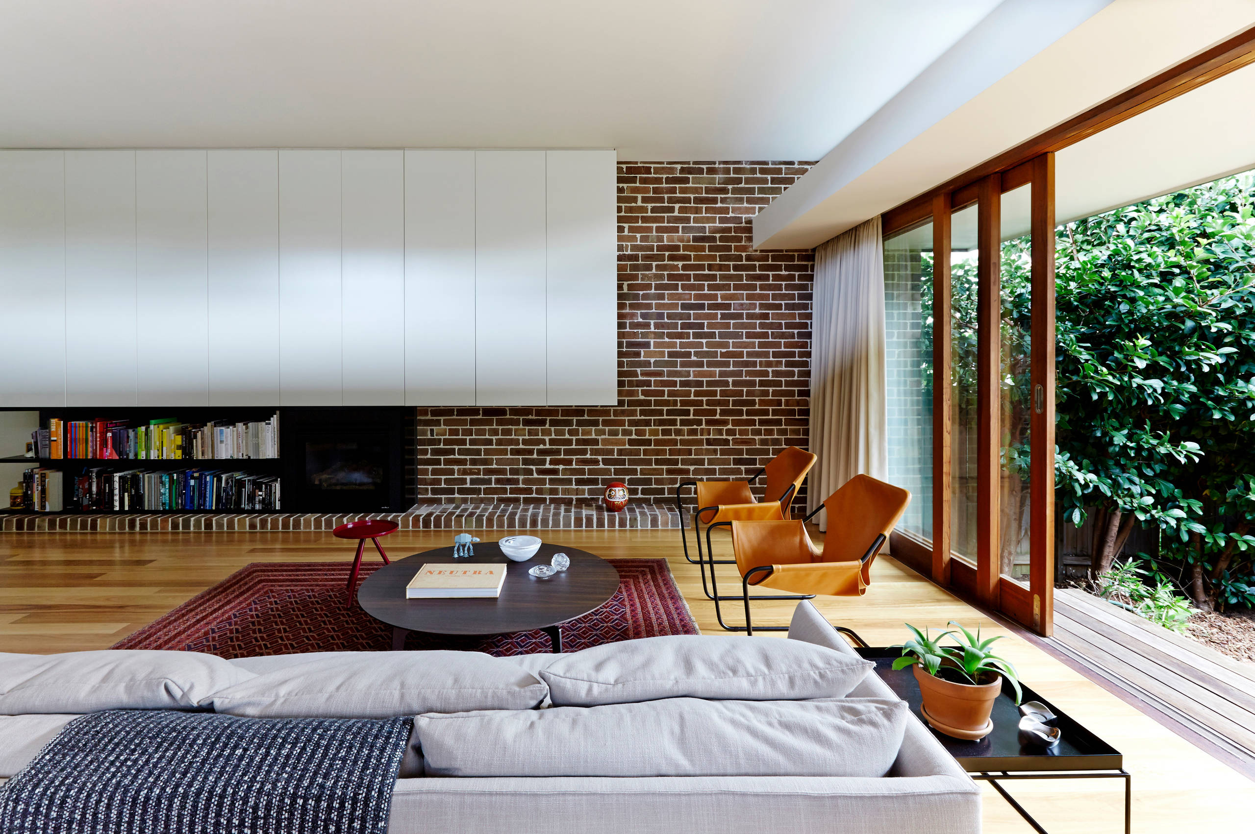 Vertical-opening doors are not that common because of their weight and the amount of space required above them. However, they can prove to be exceptional design features. In this Sydney home, two 250-kilogram vertical glass doors enclose the central garden. They are counterbalanced with a 500-kilogram weight with a rack-and-pinion system, and raised and lowered by turning a custom-crafted wheel.