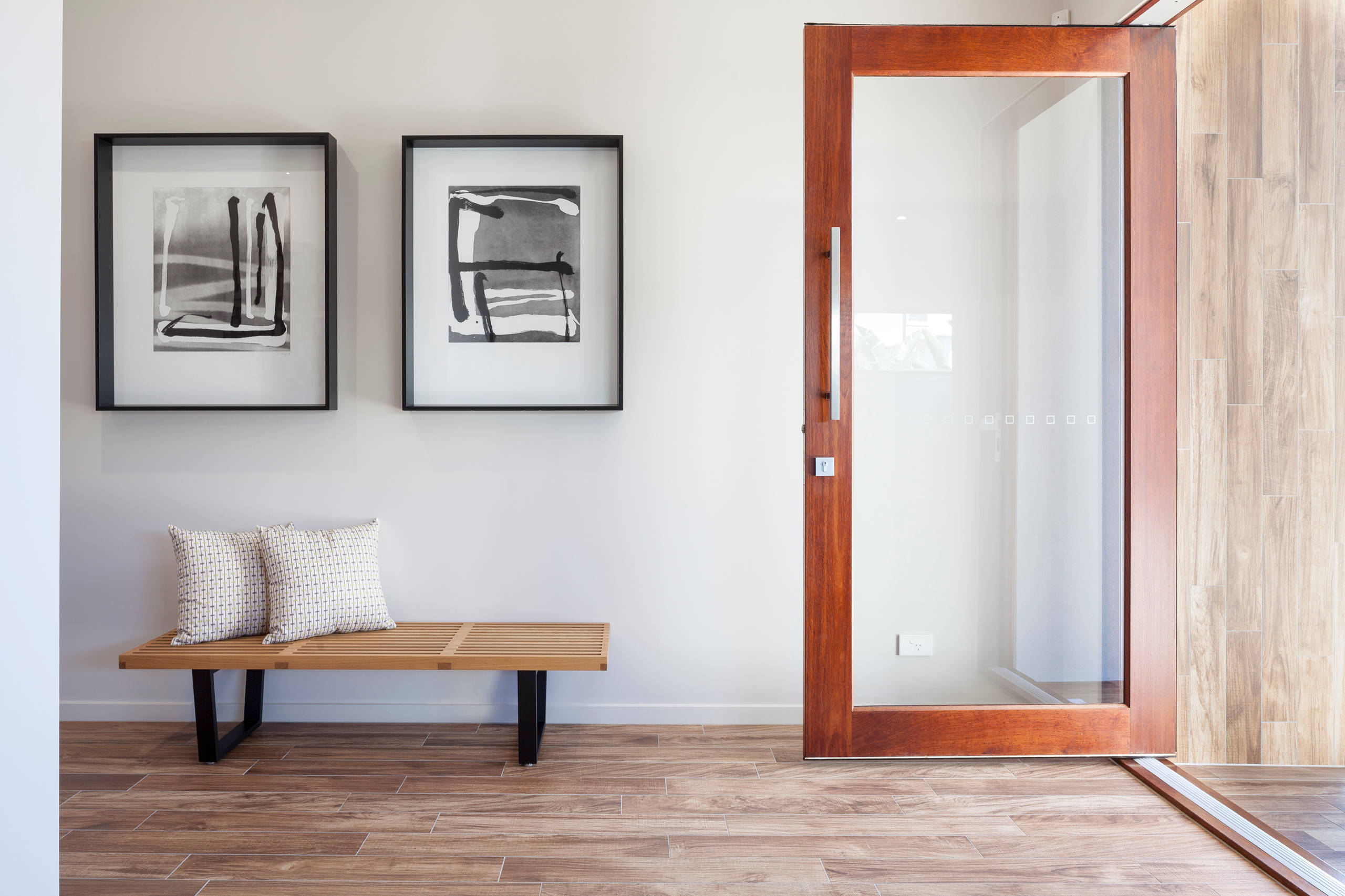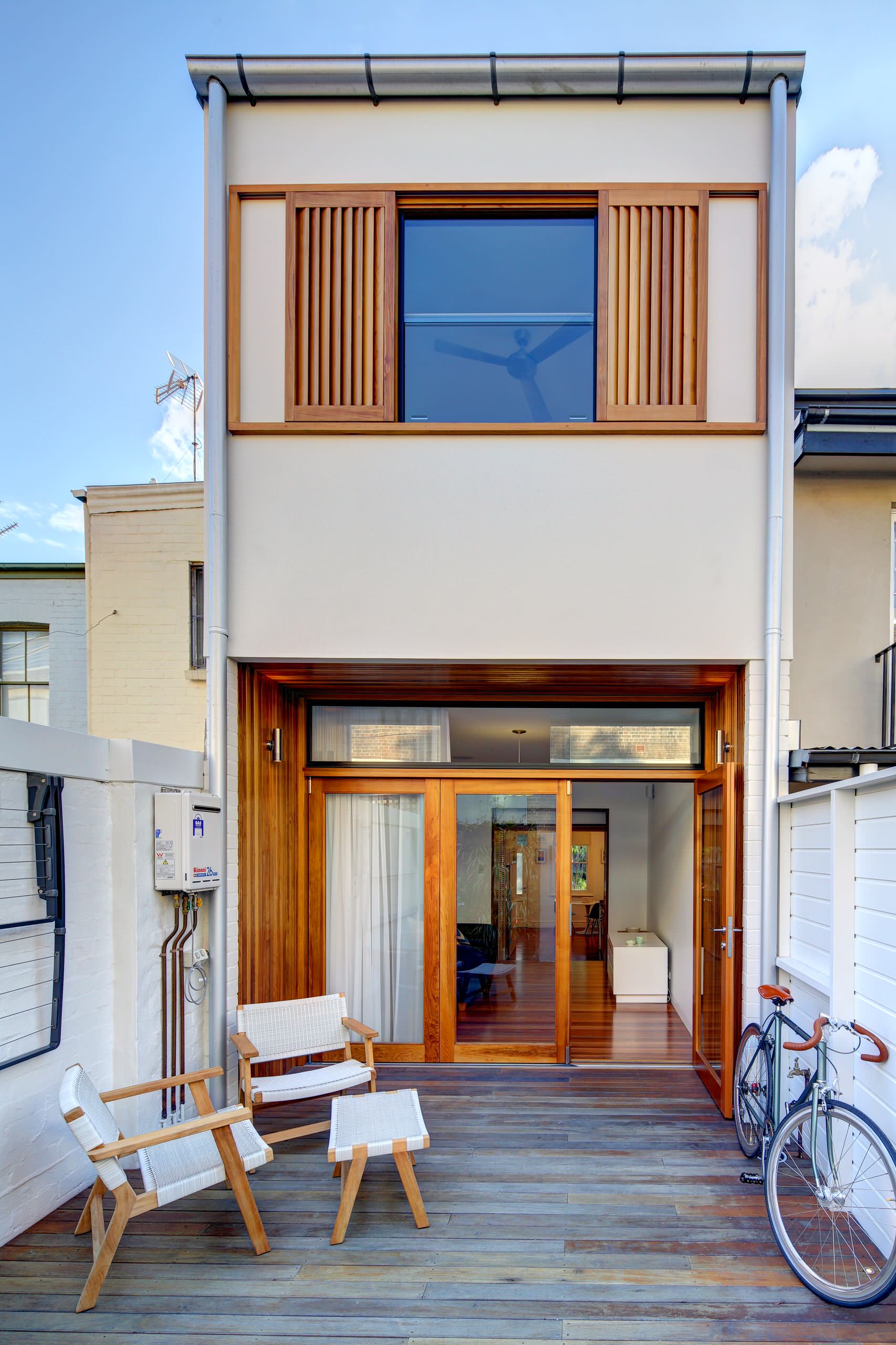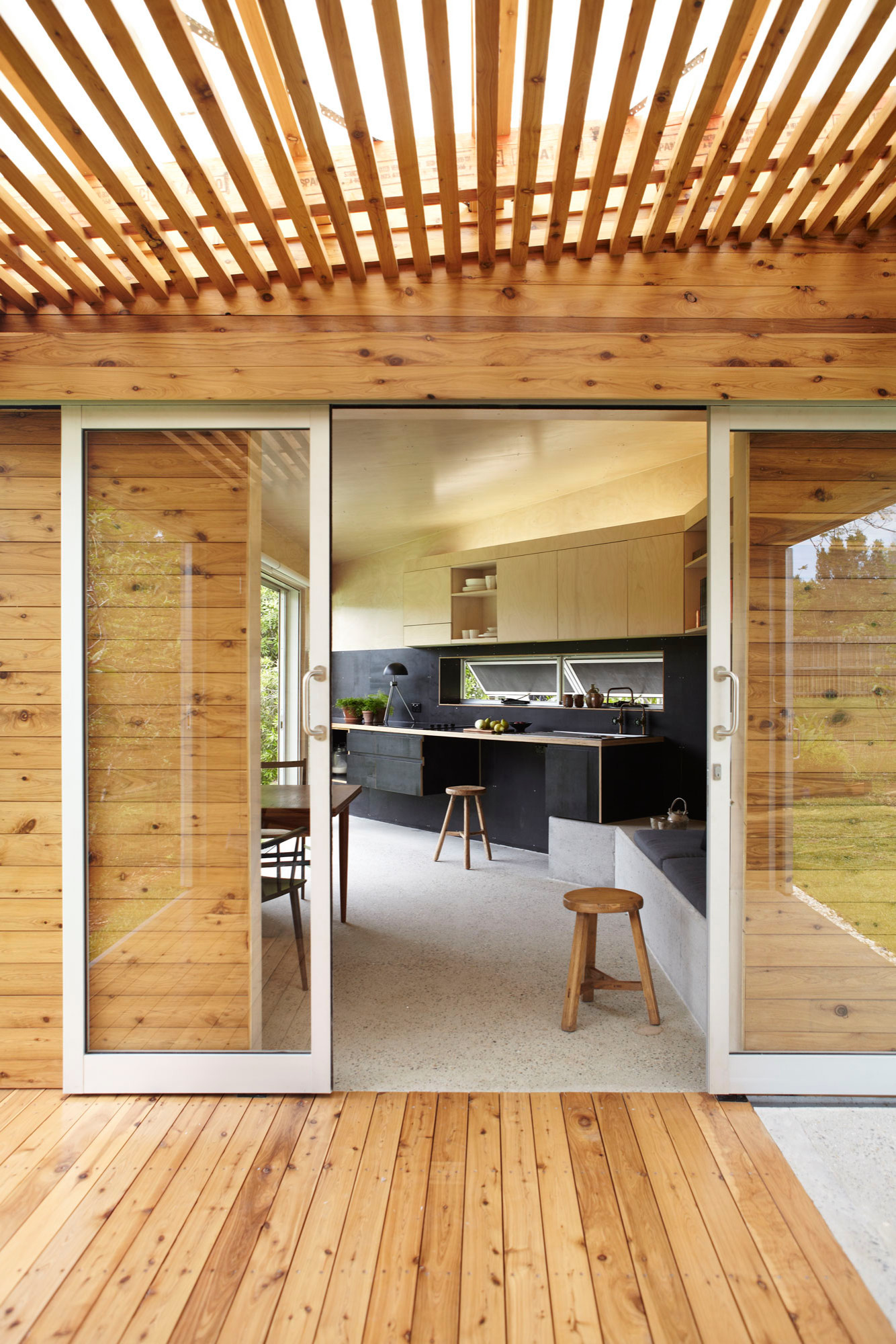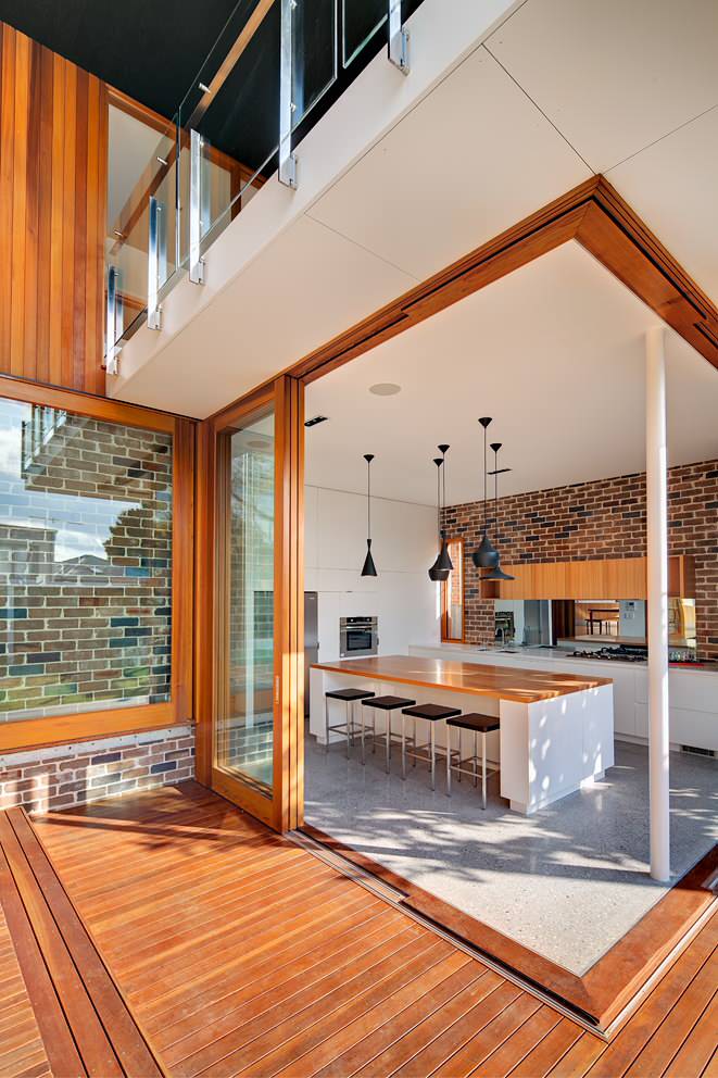 This house has three timber pivot doors in the front room that open the interior space to the front yard and streetscape, giving a very casual and relaxed look and feel. When closed, three glass panes maintain the connection between indoors and out.
