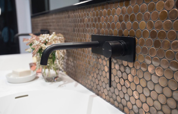 When using metallic tiles, take care not to choose clashing tapware. Matt black, as pictured here, allows the tiles to take centre stage.