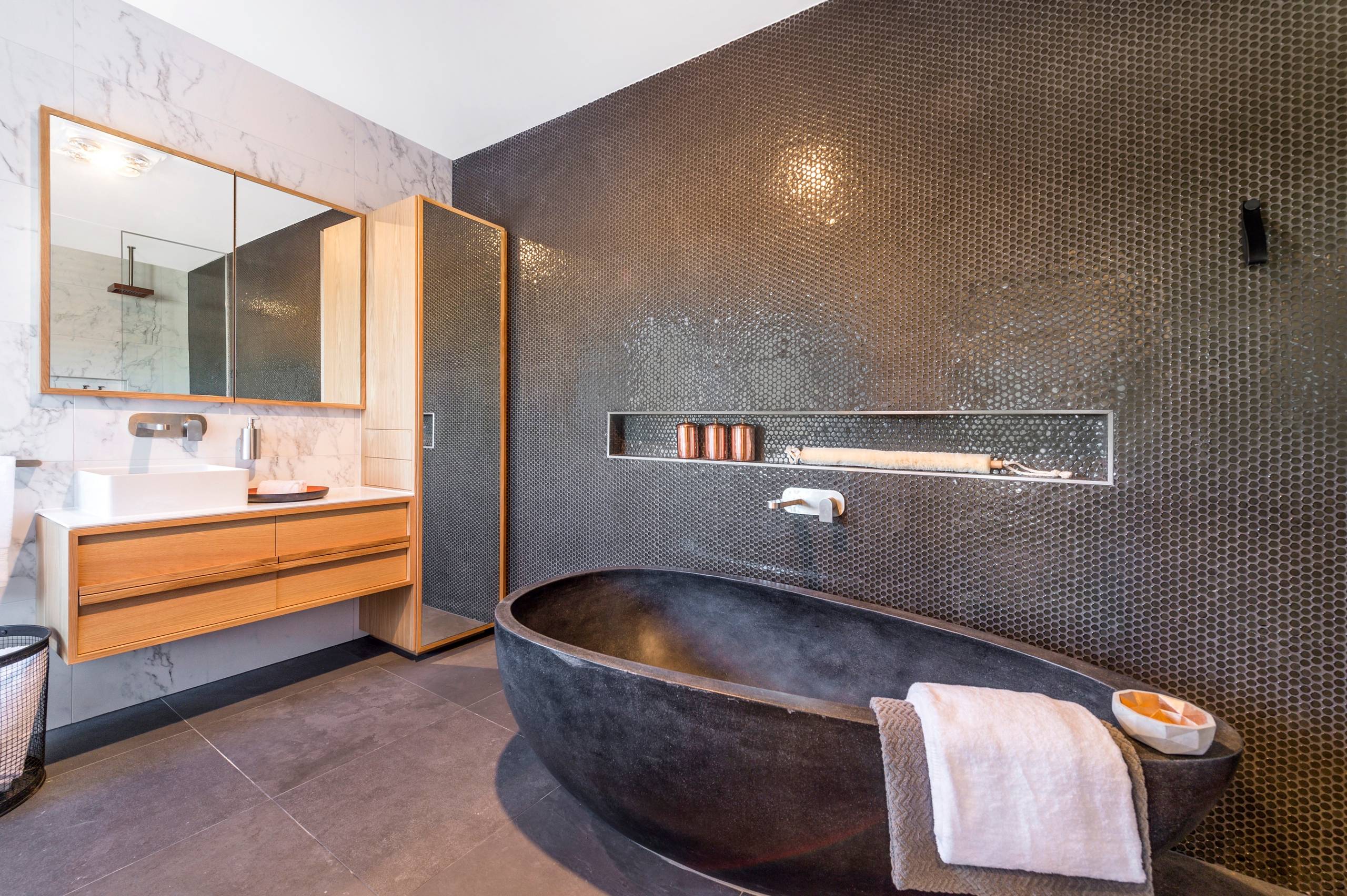 Use texture to define spaces, build mood, and add another dimension to a monochromatic colour scheme. In this dramatic bathroom, an entire wall of tiny, glossy penny-rounds is juxtaposed against oversized square matt floor tiles. O’Donohue suggests using lighting to play up the contrasting textures: concealed LED strips are ideal.