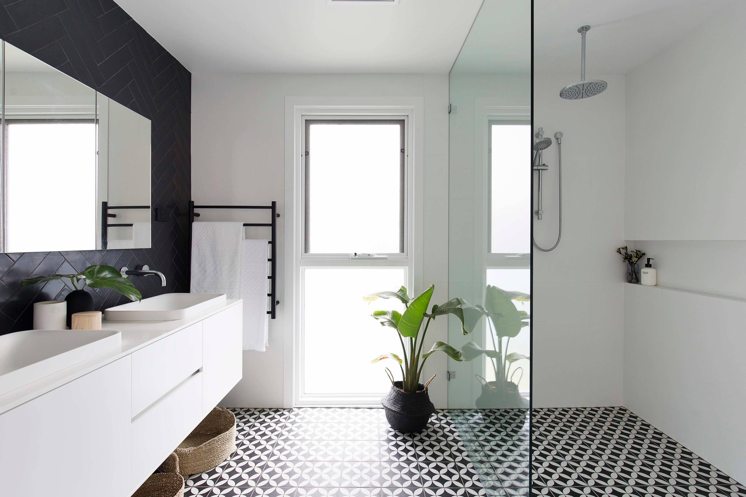 For a bolder look, choose graphic, patterned tiles, as the owners have done here. When you’re incorporating an eye-catching tile such as this one into your bathroom, it’s important to create a sense of balance – do this by keeping the walls and fixtures simple.