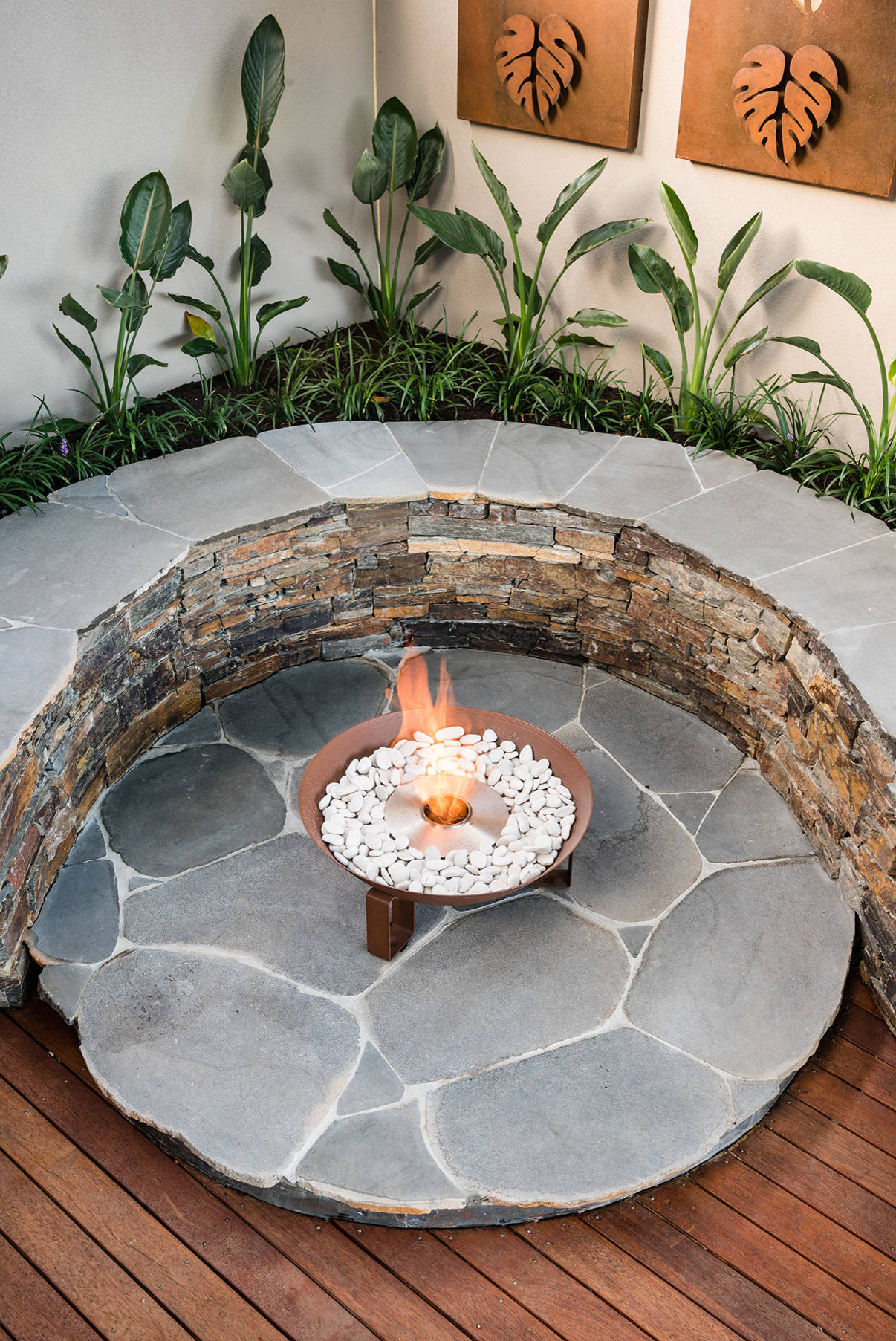 BEGINNER’S TIP: Round shapes are also considered auspicious in feng shui theory. The designer of this Melbourne garden has cleverly used a circular fire bowl to repeat the shape of the bench and stone platform beneath it.