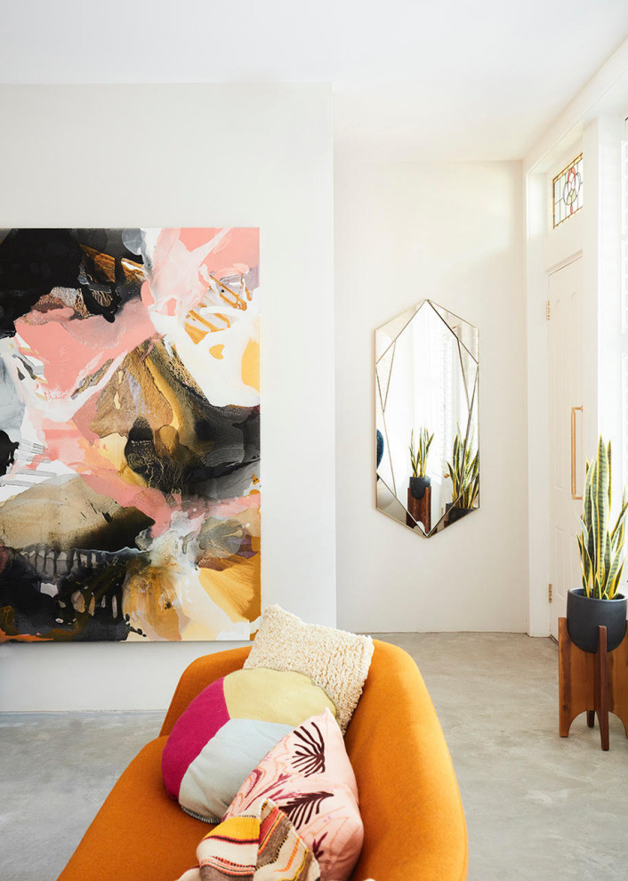 The polished concrete floor is a perfect neutral canvas to showcase the art and object collections as well as the colourful statement furniture.