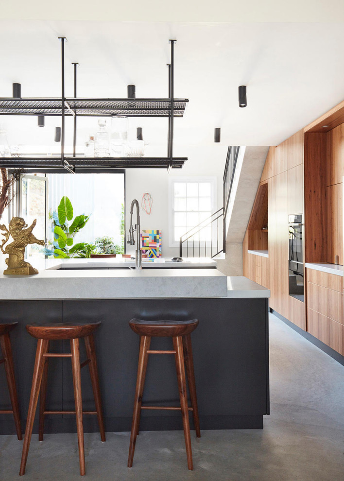 - Moved the kitchen into the centre of the living area and installed a U-shaped island and custom black metal suspended shelving.