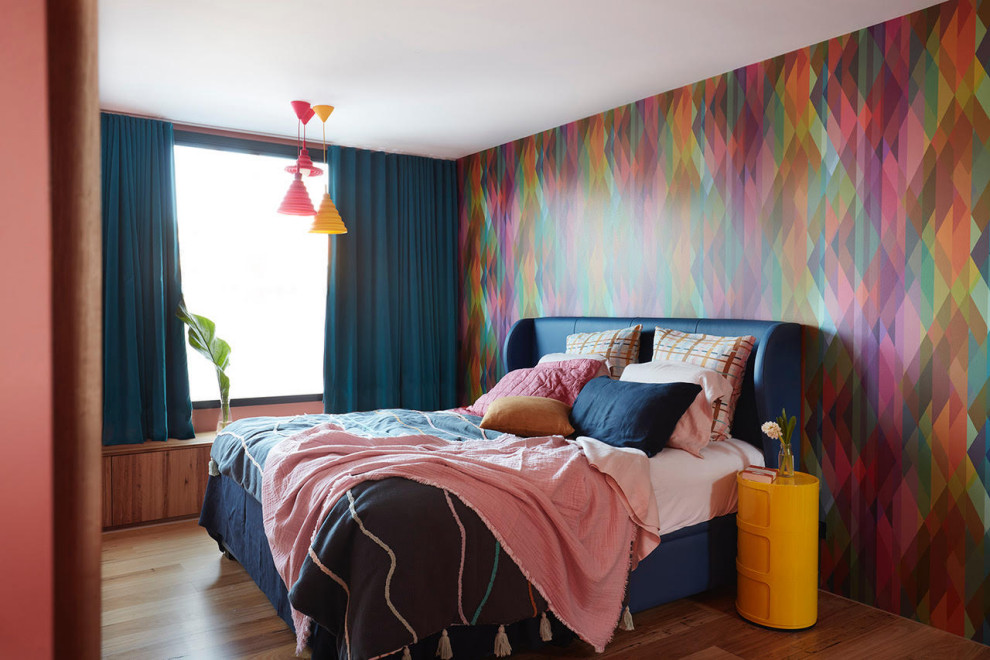 The client really wanted a joyful explosion of colour and pattern in the main bedroom. For the walls, we chose Prism wallpaper from Cole & Son.