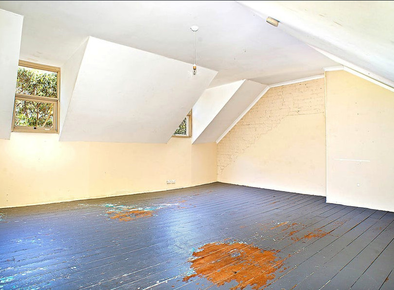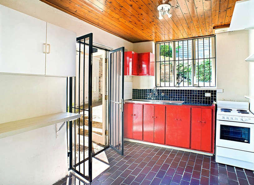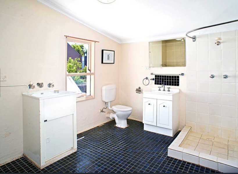 The house had low ceilings, old paintwork, neglected cypress-pine floor boards, a pokey rear kitchen with red-painted joinery, an older bathroom and laundry with damp walls and mouldy tiles, and an outside toilet in the rear of the courtyard.