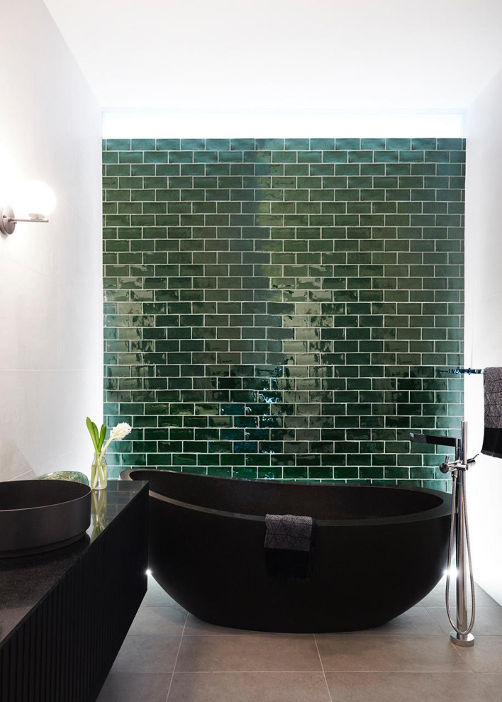 - Ensuite wall painted in Porter’s Paints Mexican Lime.