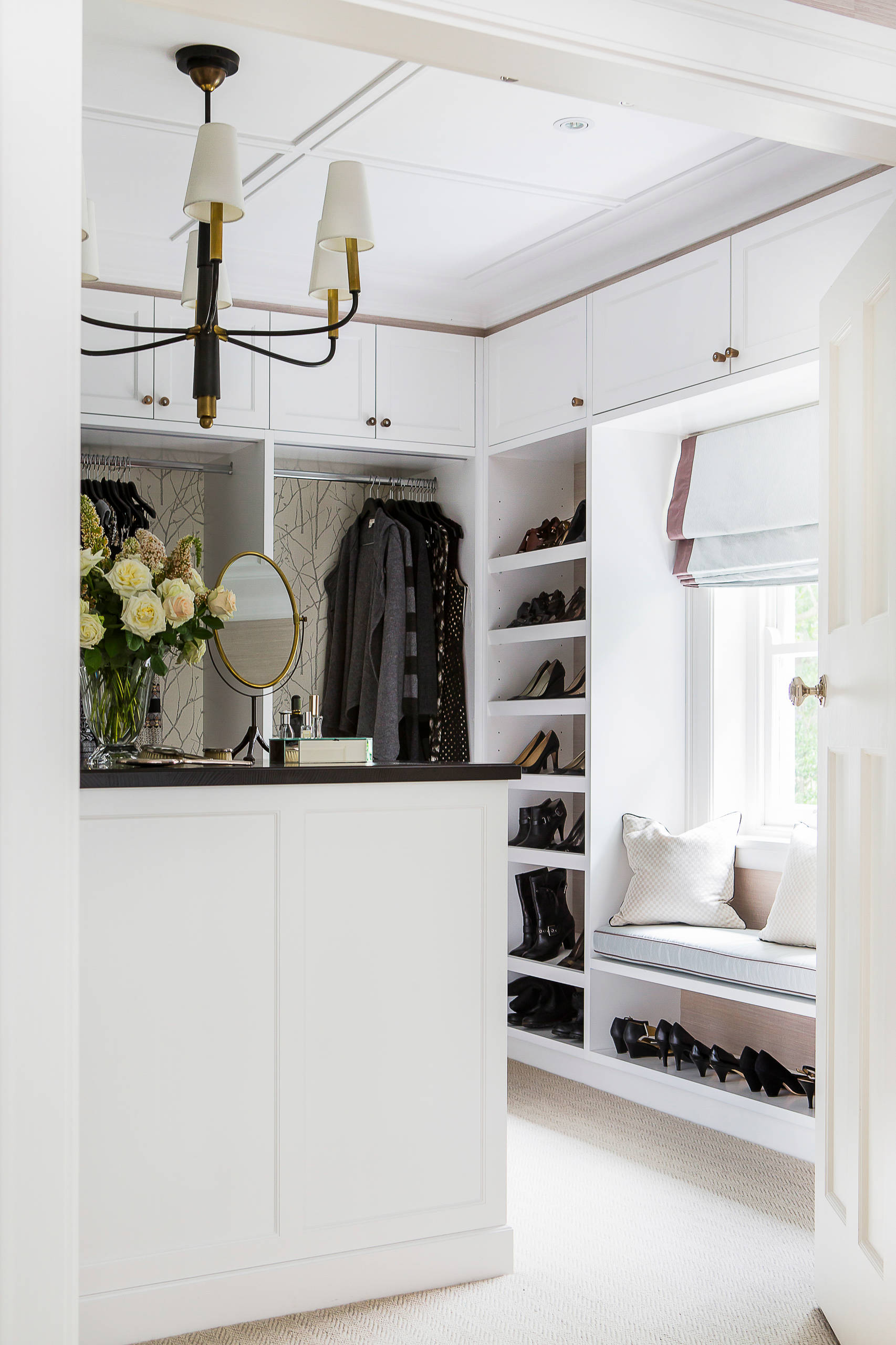 Whether from natural or artificial sources, you’ll need plenty of lighting in your walk-in wardrobe. A skylight or picture window that can be opened is a great way to illuminate and ventilate the space, but if that’s impossible to install, keep to warm-white down lights. Consider adding a gorgeous pendant light if you have the space as it ups the glam stakes enormously.