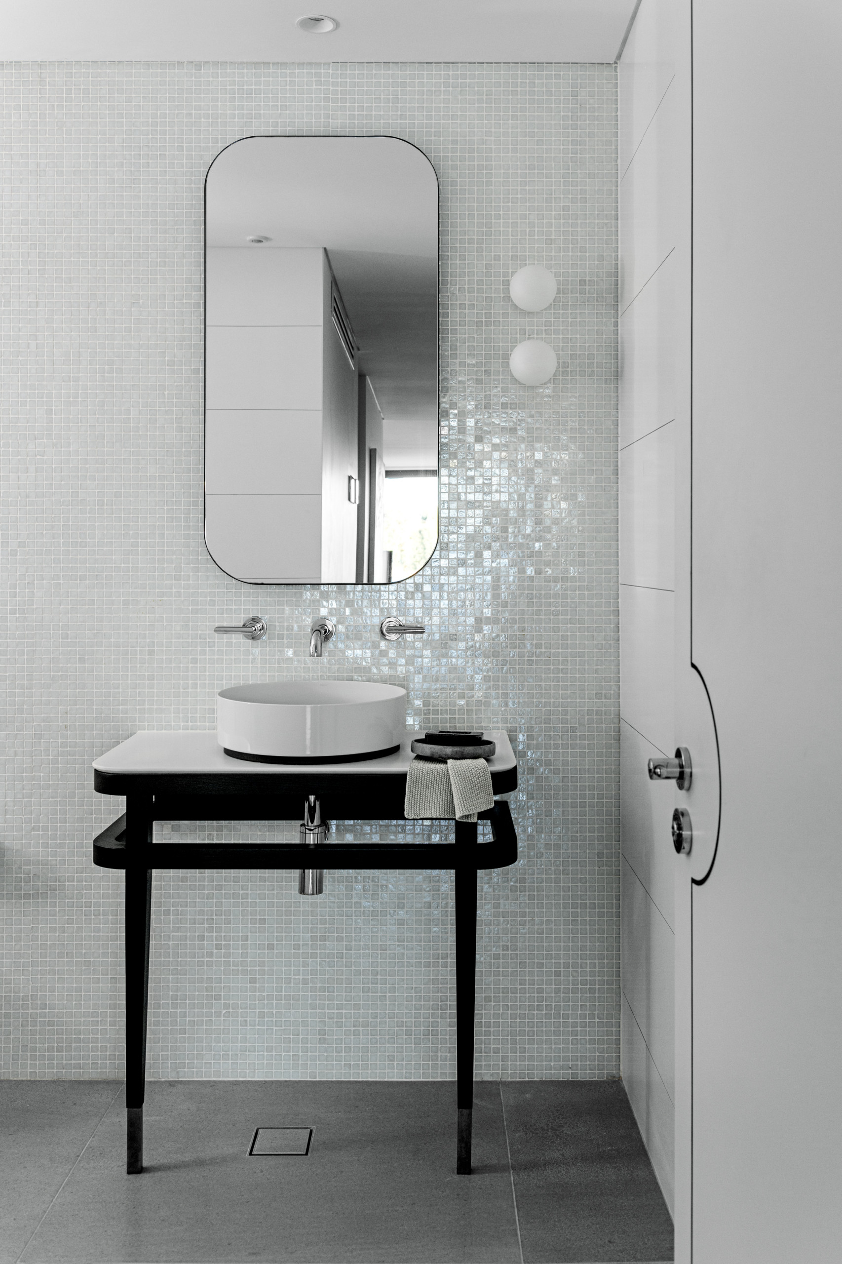 - We’re seeing a lot of white opal spherical lights in bathroom designs at the moment. They give a gentle light to a room and sit well with grey tiles. Beware though, these don’t necessarily give you sufficient illumination for task lighting at the mirror.