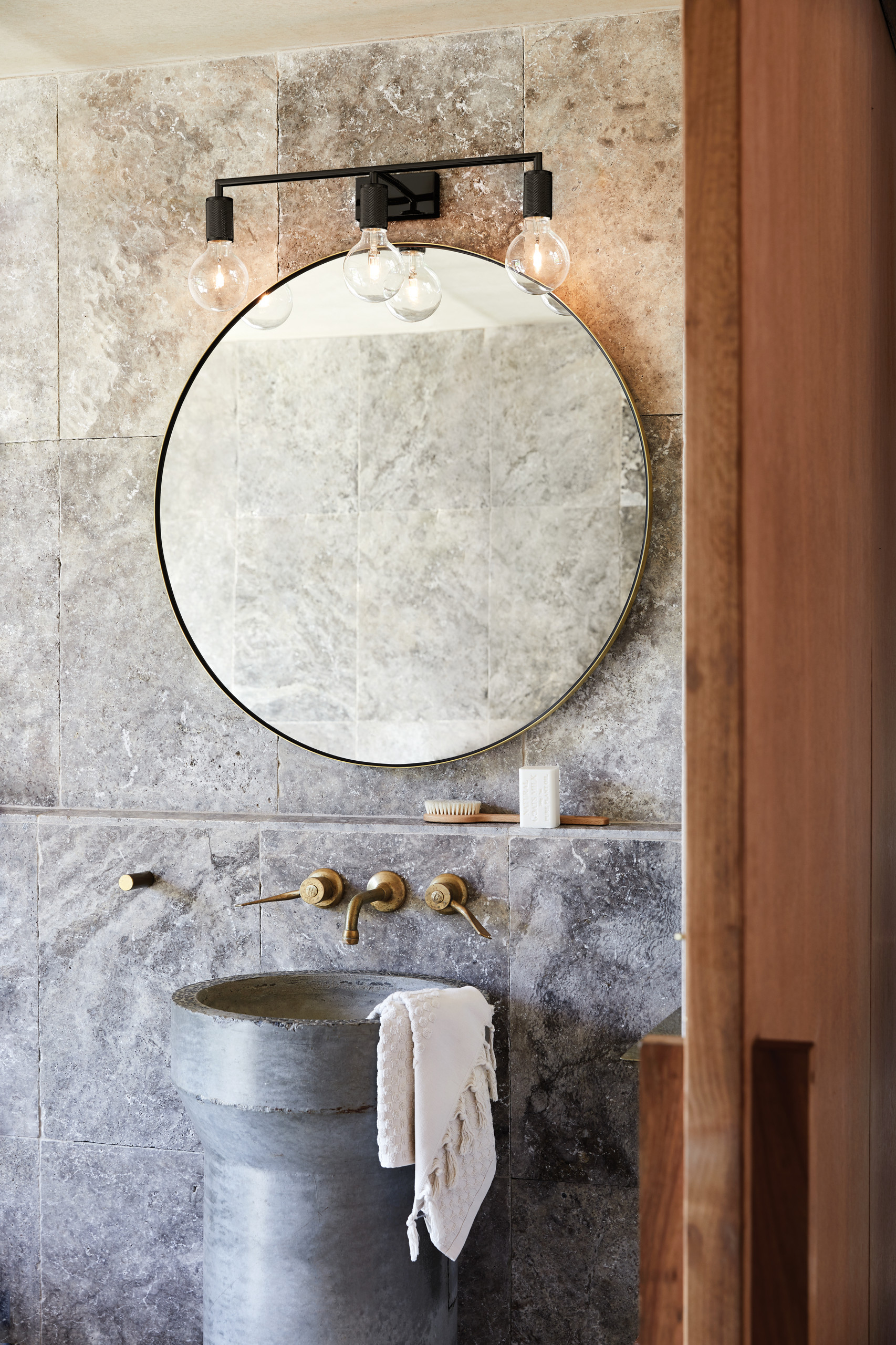When it comes to the right mounting height for lights on either side of the mirror, aim for mid-face level, she says.