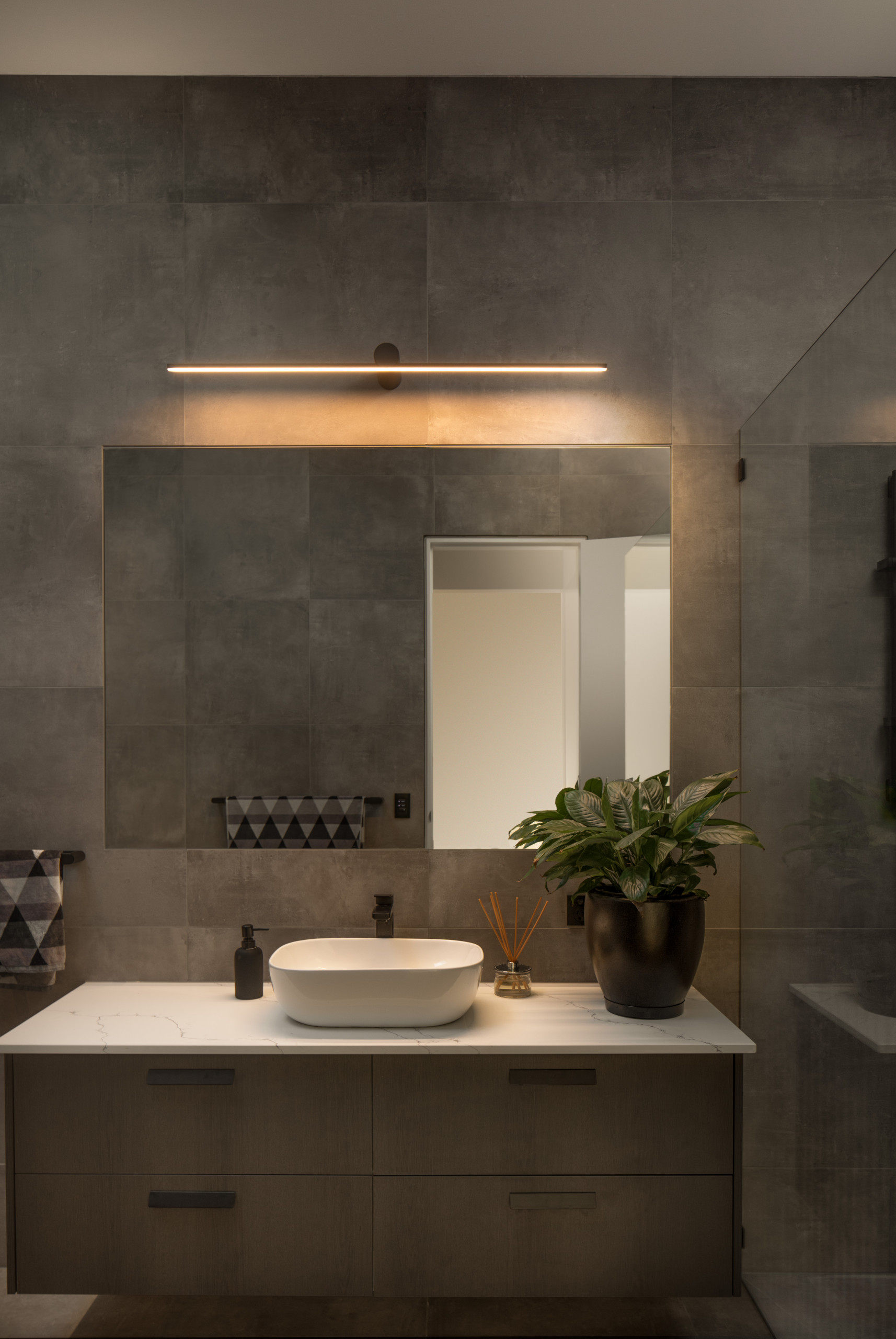 As ensuites are generally small, they don’t usually require as many lighting sources, says Locke. “They can often be lit effectively with just mirror lighting and a nightlight. This set-up allows you to see what matters and you won’t be woken up by the night light late at night.