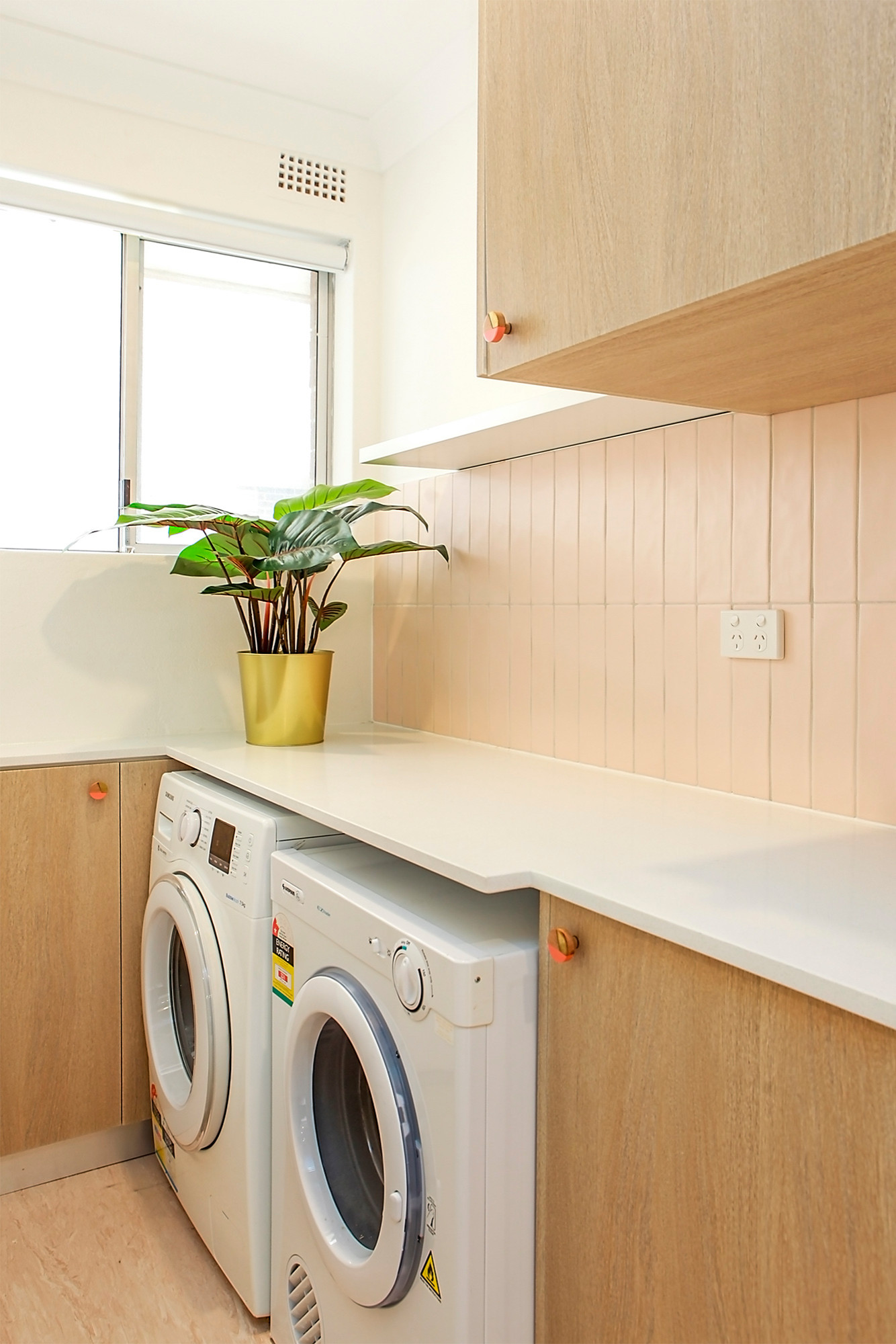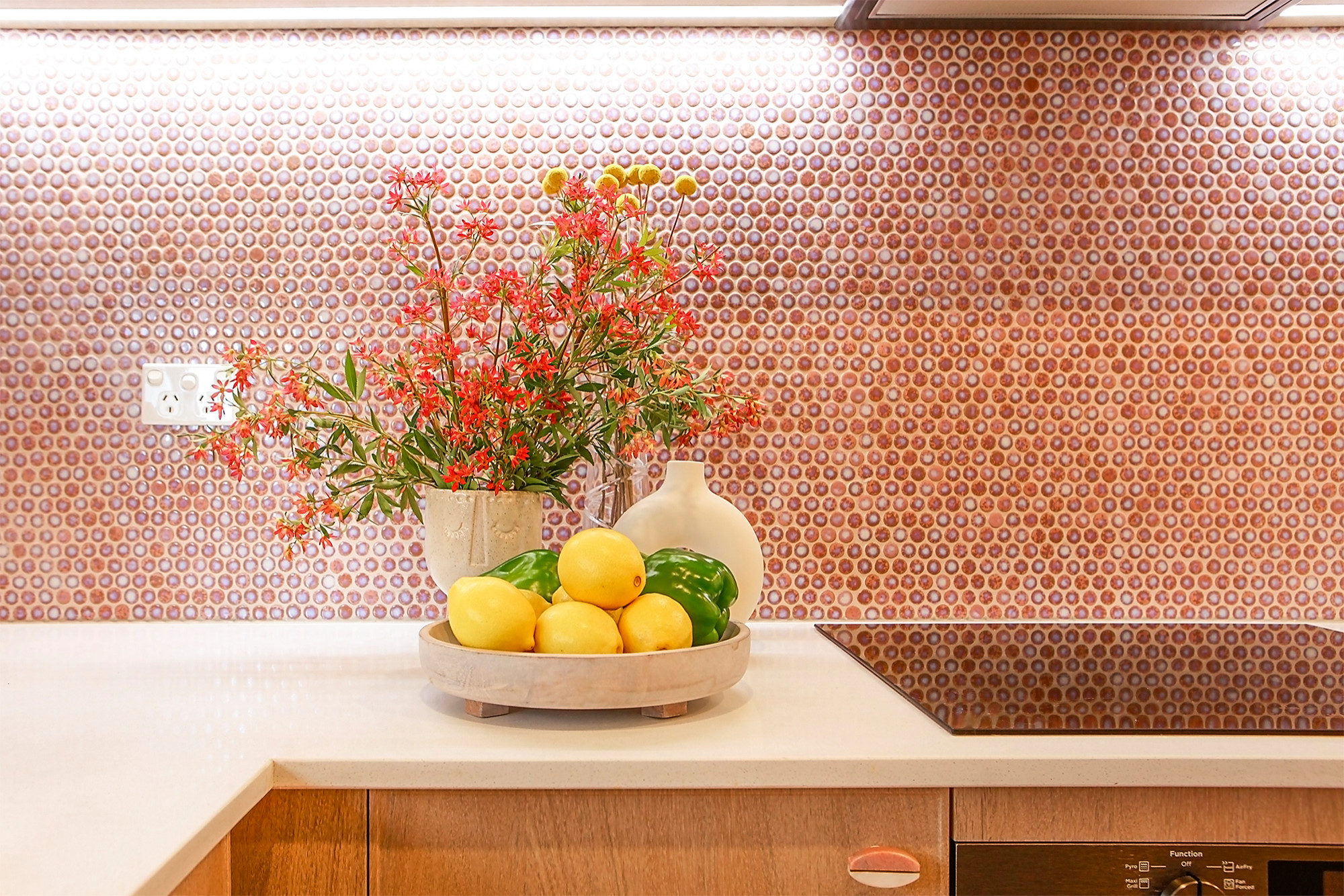 We replaced the dated tiles and yellow benchtops with a fresh white benchtop, pink penny-round splashback tiles and timber doors.