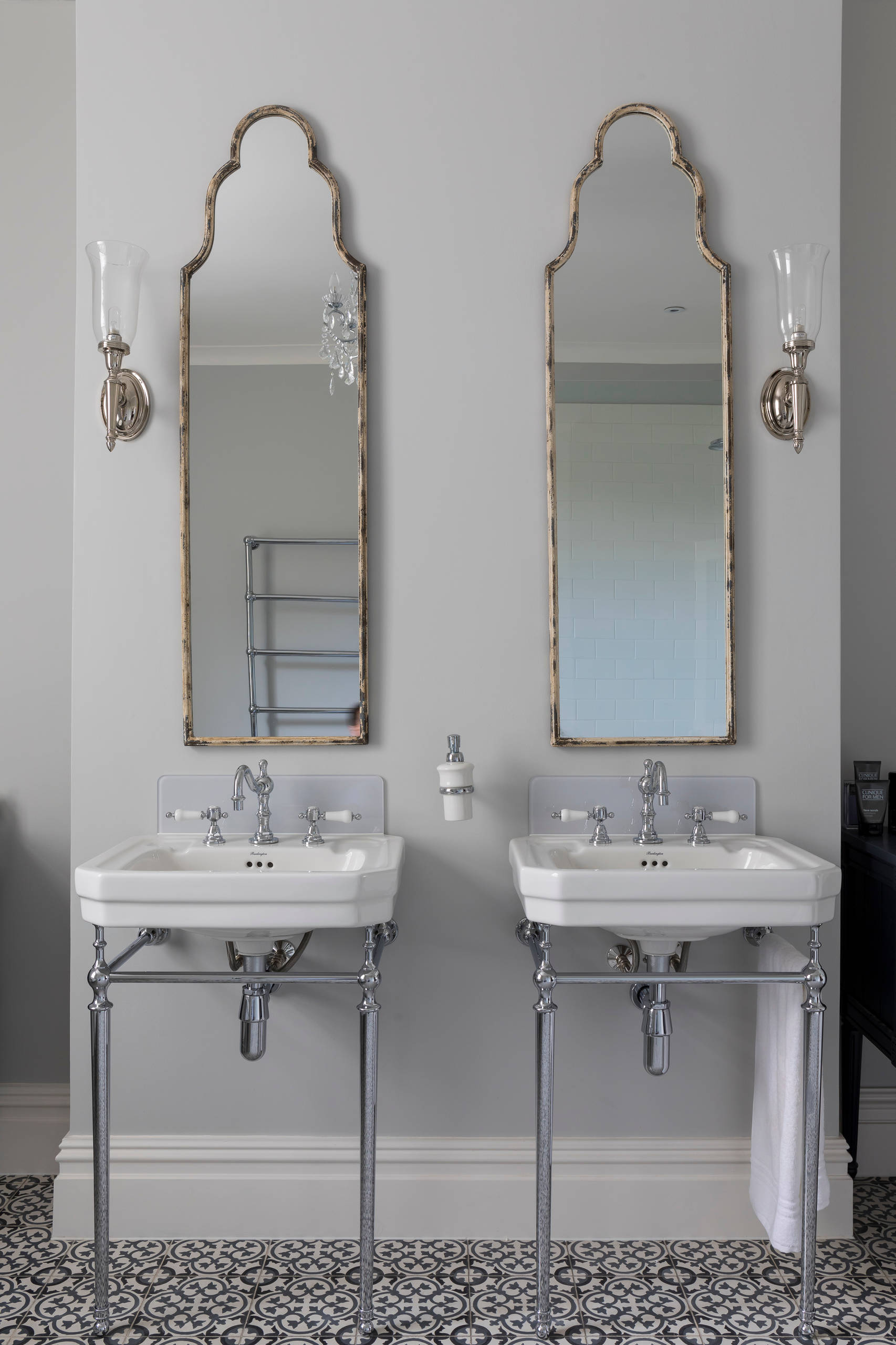 For an instant shot of Victorian elegance, position a vintage-style mirror over your basin. Here, the designers have gone for two matching versions over double basins.