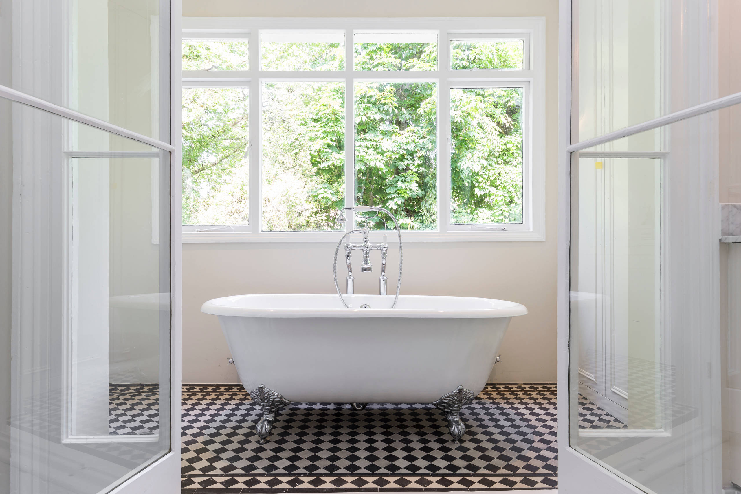 Here, the white walls and bath form a blank backdrop to showcase the black-and-white chequered expanse of floor tiles. With a striking monochrome design like this, there’s no need to add too many other elements.