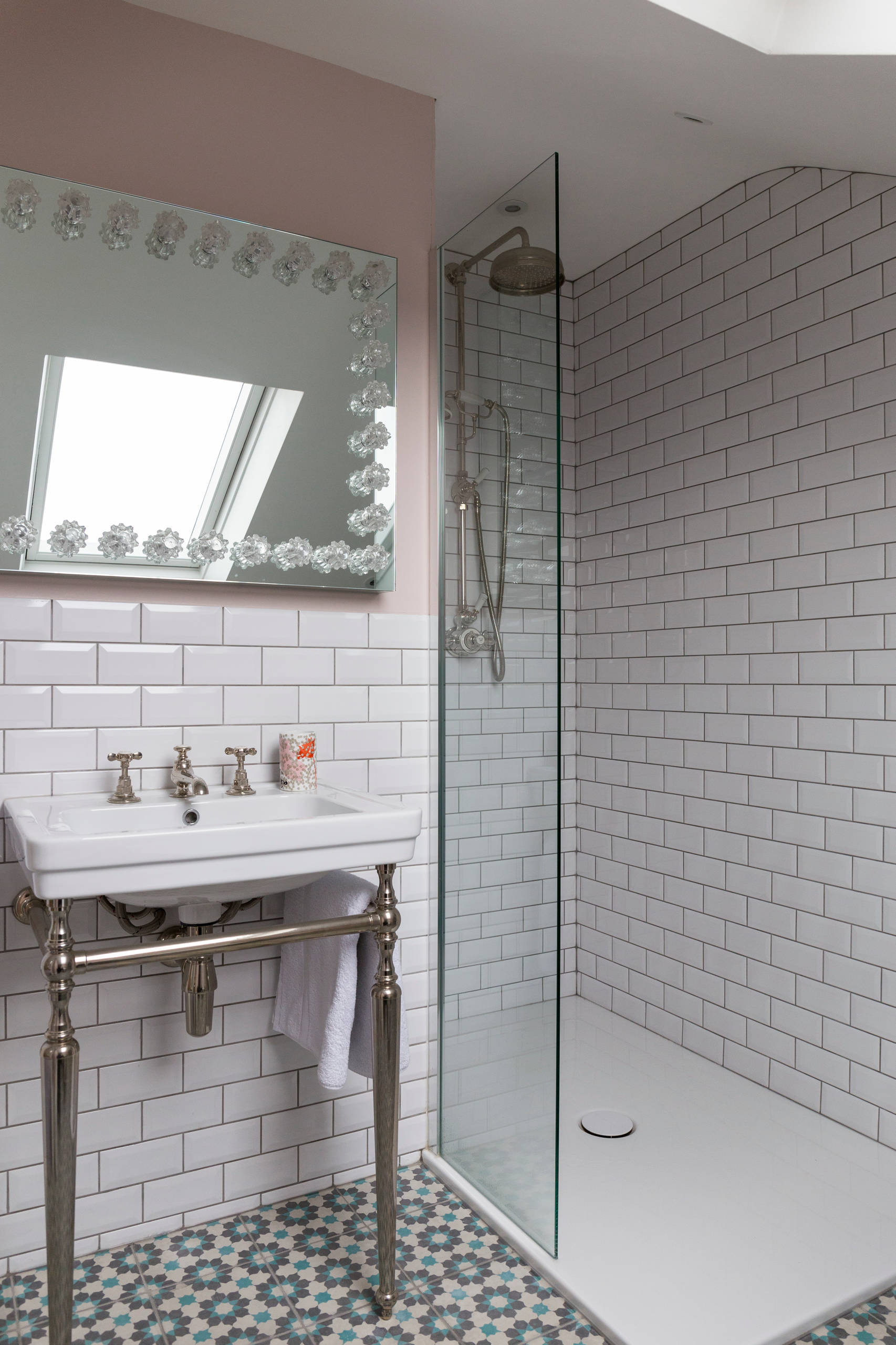 The table’s rolled legs and pretty details give the bathroom an elegant feel, and provide a soft contrast to the sharper lines of the tiles and mirror.