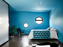 Haden and Elizabeth specified a walk-in wardrobe for their master bedroom, and high windows here also frame views of trees and clouds.