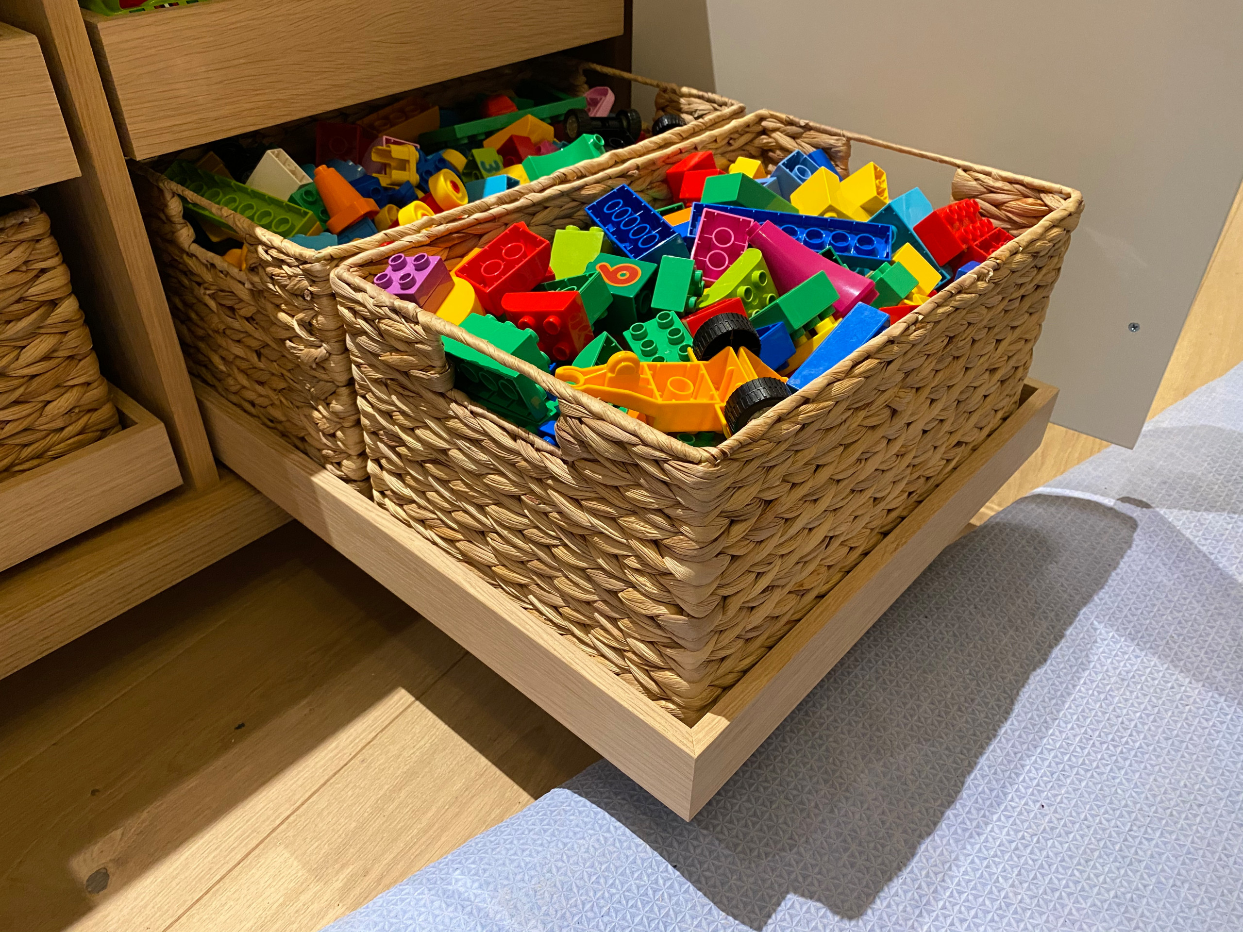 In this project, we designed the cabinet to perfectly house baskets that my client already had and liked. The baskets’ contents can change over time as the family’s needs evolve.
