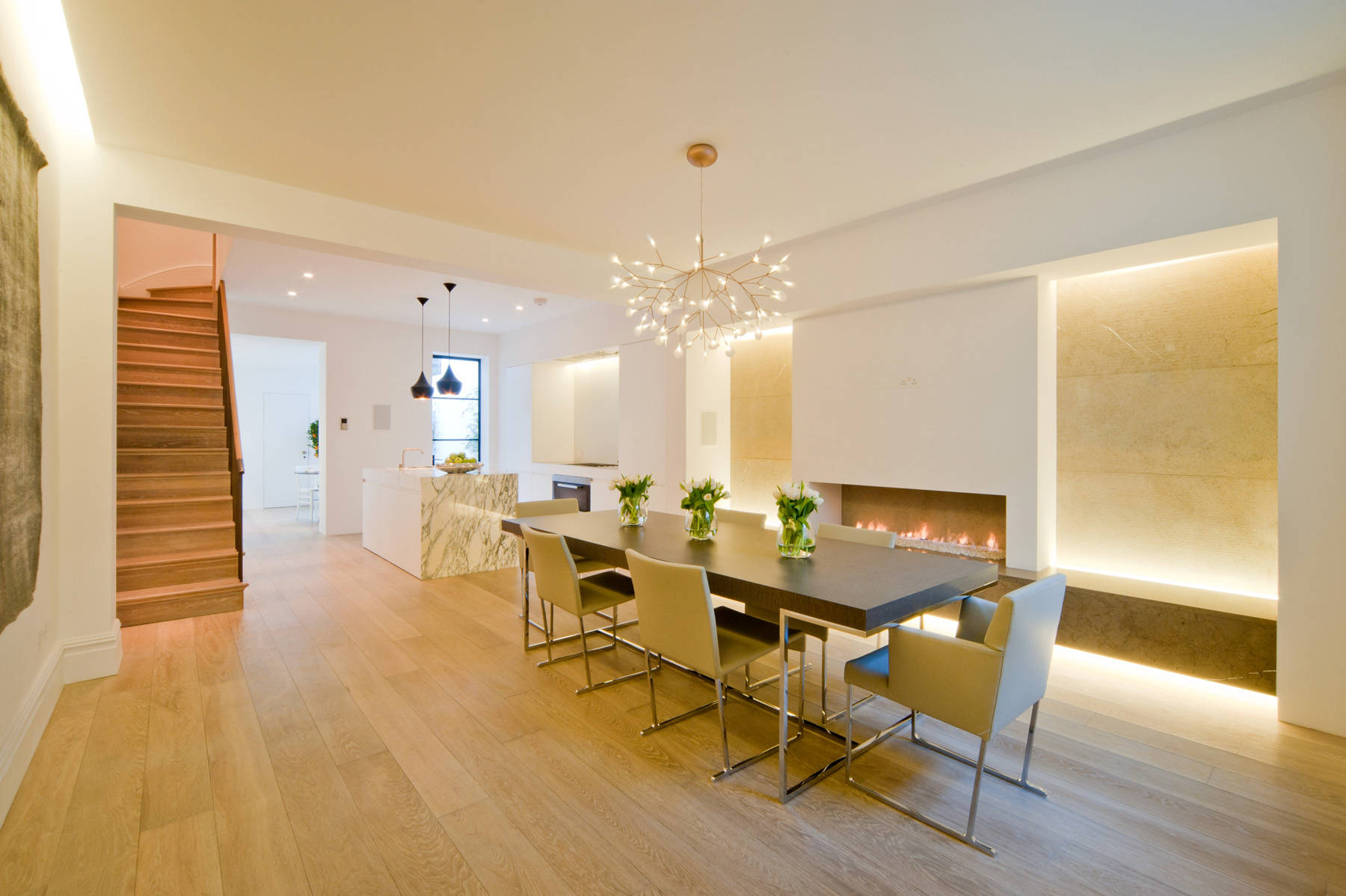 Custom brackets allow the suspended lighting strip to create intimate dining light, while floor-recessed, colour-changing uplights provide a different perspective, framing the windows and doors.