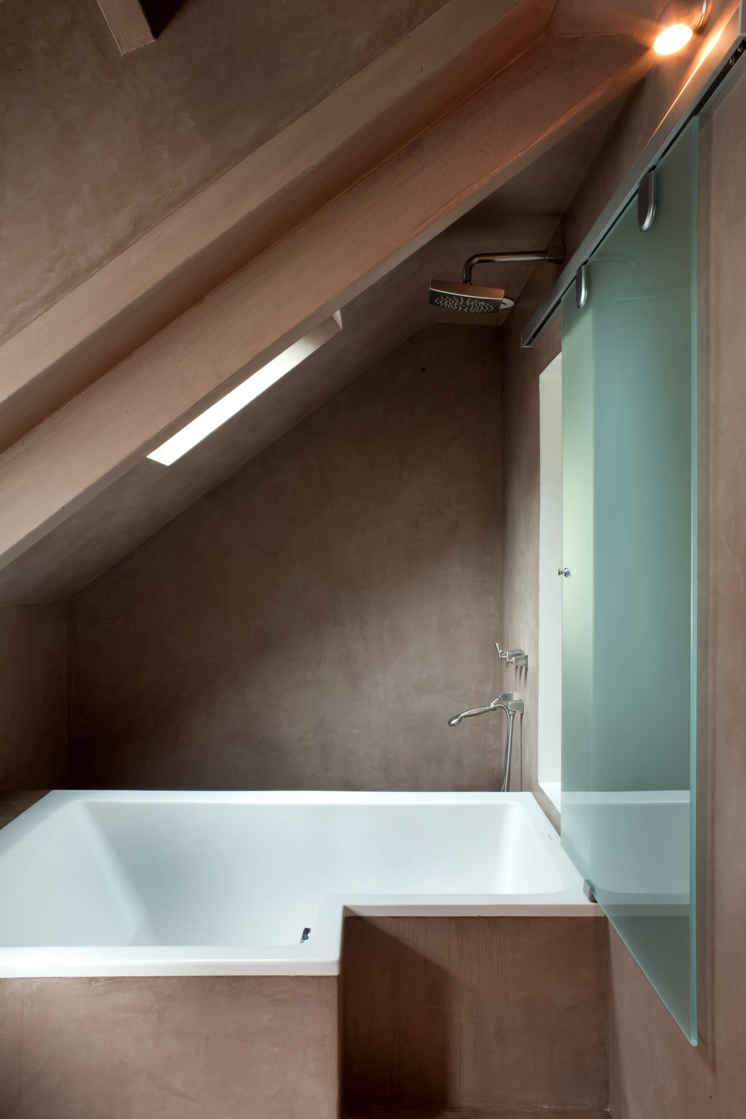 When space is really tight, radical solutions are called for. In order to have a decent-sized bath, it might have to completely fill part of the room, rather than sit within it. This long, narrow room has a large bath filling one side…