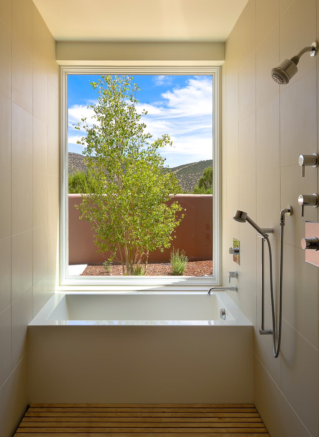 Fit a tub that matches the width of the room for a snug, streamlined feel. This lovely bathroom is also blessed with a large picture window that spans the rear wall and makes a bold statement.