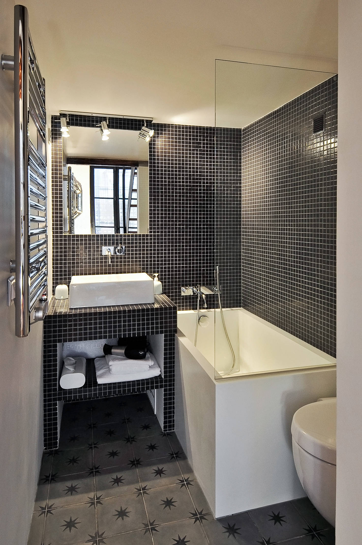 This small bathroom uses a monochrome palette to create contrast between each tightly packed piece in the room, giving each item its own individual character and adding plenty of drama.