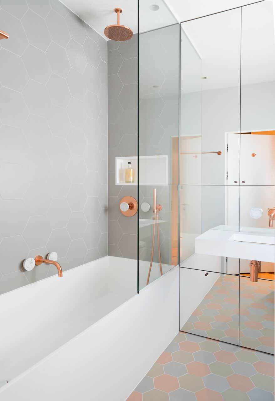 The complementary coral accent in the floor tiles helps to tie the look together, and that mirrored wall not only has the wow factor, it enlarges the space and bounces light around it too.