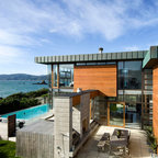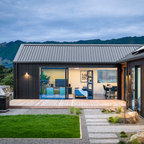 contemporary architecture · contemporary home · corrugated iron exterior · garden lighting · grey home · modern landscape · New Zealand Architecture · new zealand homes
