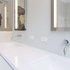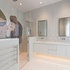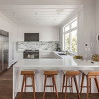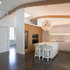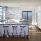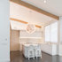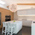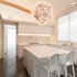 The FLOS Taraxacum 88 brings a warm and bright glow to this modern kitchen featuring a neutral color scheme, a white kitchen island and white seating.