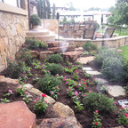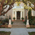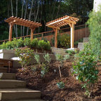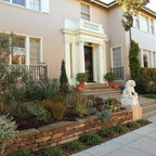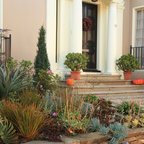 A twist on a classic Asian Style landscape with succulents, old school stone walls and traditional SF architecture as a back drop