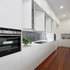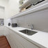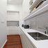 Great use of a narrow space without overwhelming the area. This type of layout with sink further away could work if you wanted to retain the door outside. In which case, cover the window (to provide more shelf space) and install a back door with a window. Also remembering that the door will lead to your new decking so you will also want it to look nice when looking from the deck.