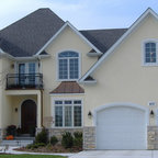 Colours trim columns millworker over centre part. Meta roof over left side.