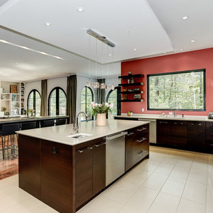 Beautiful high contrast kitchen featuring our Contemporary Proline PLFW 750 Professional Stainless Steel Wall Mounted Range Hood. The Red Walls, Dark Wood Cabinets, Island Pendant Lighting, and Modern Clean Lines make this kitchen really stand out.