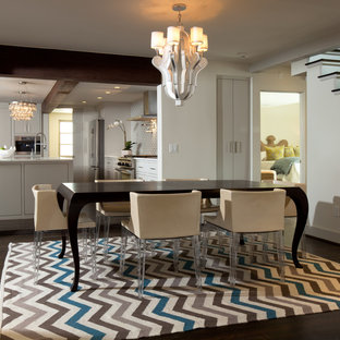 An open, simple dining room with chevron rug, mademoiselle chairs, and unique chandelier.