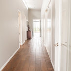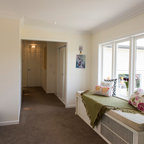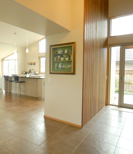 Double height entry area lined with cedar timber, floors are porcelain tile which connects through to kitchen, dining and family area.