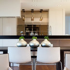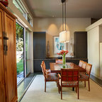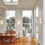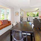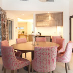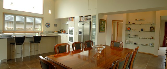 Kitchen and dining area, fully tiled with ceiling sloped to double height. Adjoins family area and has masses of windows providing light and sun.