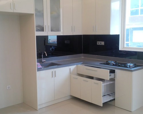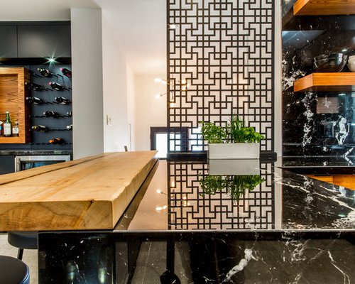 Wenge wood mixed with frosted glass and stainless steel is used in this contemporary custom Arbor Mills kitchen. Integrated lighting adds functionality to this serene space.